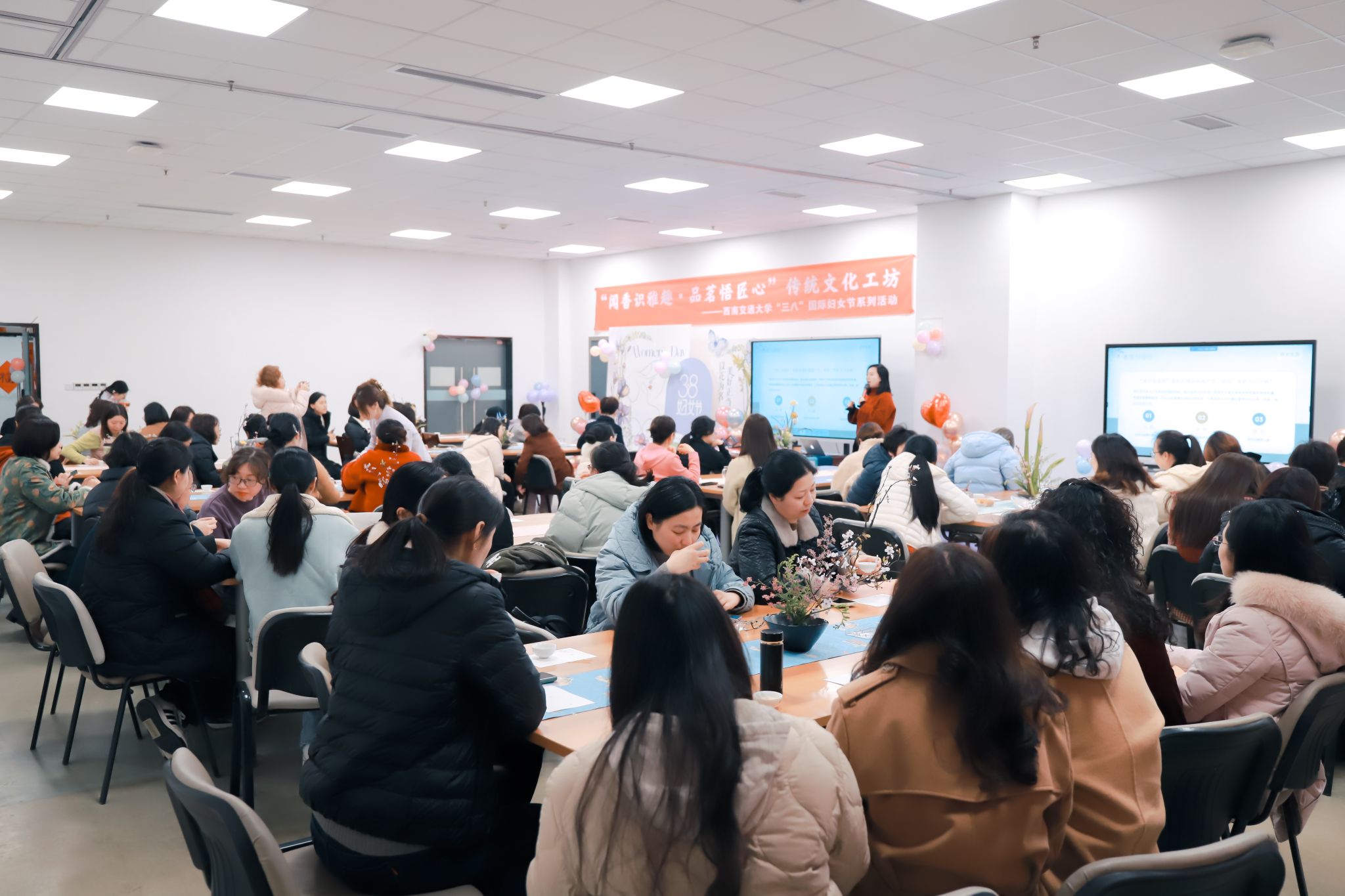"她风采・她绽放"主题活动,注重文化传承与生活品质提升。建筑学院工会带领女职工体验唐代漆扇绘制,感受非遗文化魅力;图书馆工会组织的“闻香识雅趣·品茗悟匠心”传统文化实践工坊,以茶道体验、香道品鉴来以茶会友,以香养心,感受传统文化的魅力。各部门工会还自主开展了插花、化妆、春游等特色活动,女教职工积极参与,在活动中奋力展现新时代女性风采,为学校发展贡献"她智慧"与"她力量"。
