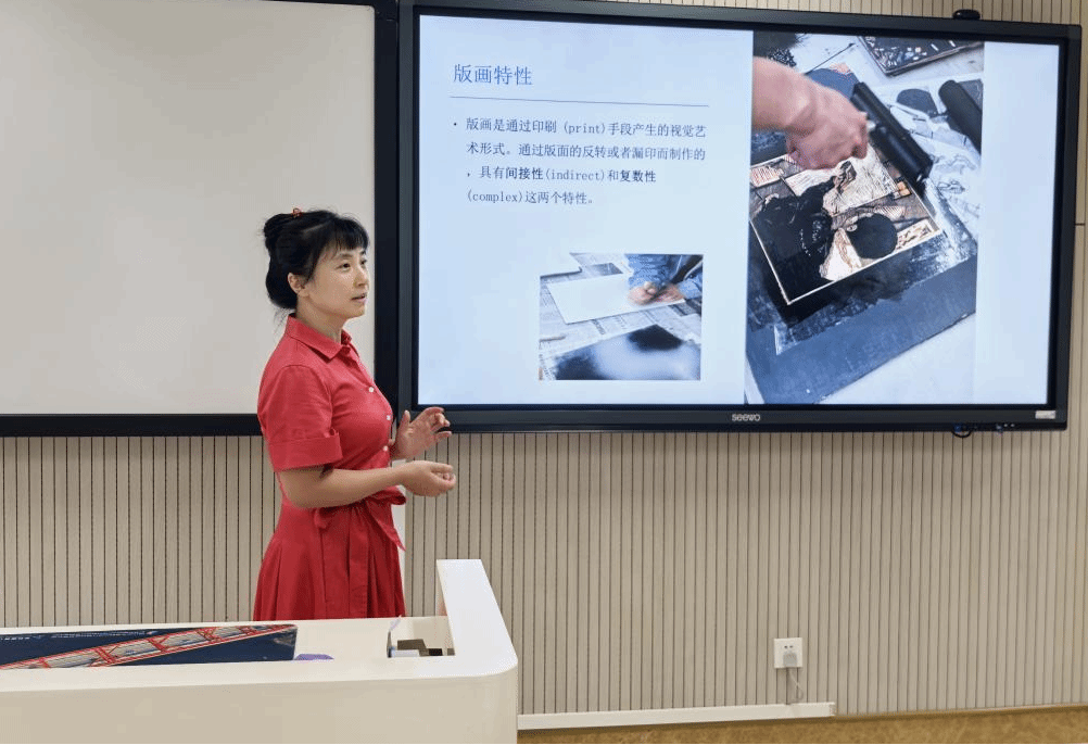 朱丽娅老师详细介绍了版画的发展历史、雕刻技巧以及不同类型与风格特点,并引领大家一同鉴赏了极具代表性的木刻版画佳作。朱丽娅老师现场演示了雕刻过程和不同刀具的使用方法,演示了不同刀具的运用方式,同时针对雕刻、印刷等环节的注意事项作了详细说明与提醒。