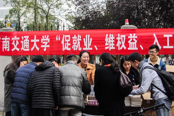 为积极响应省教科文卫工会号召,在高校继续开展“入工会、维权益、促就业”工会知识进高校活动。2016年11月8日中午十一点,在best365英国在线体育工会副主席盛鹏的带领下,工会老师及学生一同前往西南交大犀浦校区四食堂门前开展“促就业,维权益,入工会”活动。