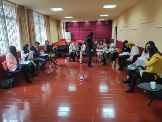 第二个活动是由各位老师在彩笔里选择代表自己家乡的两个颜色并阐明原因,然后在团体中介绍自己。老师们彼此间交流,相互了解。张老师表示:通过介绍自己家乡的特色,可以更快地了解彼此,调节欢快的氛围,拉近心理上的距离,从而进行更深层次的交流。