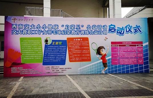 2018年11月10日上午,西南交大小小健康“启蒙星”公益活动,即交大教职工子女羽毛球启蒙教育训练公益计划在犀浦校区羽毛球馆正式启动。本次公益活动由校工会主办,其目的在于积极推动国家全民健身战略计划,落实校工会切实关爱教职工、注重民生,让我校教职工子女真正受益,并特邀王新星老师领衔的教练组打造本次活动计划,为我校教职工子女提供运动锻炼科学指导的公益性活动,并注重羽毛球锻炼的兴趣培养和推动下一代运动锻炼习惯的养成,同时提升体质。