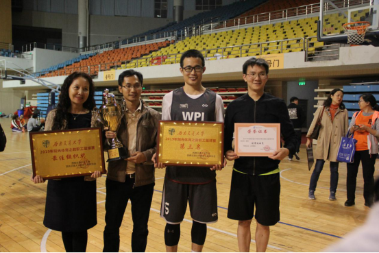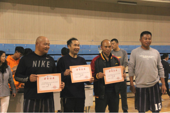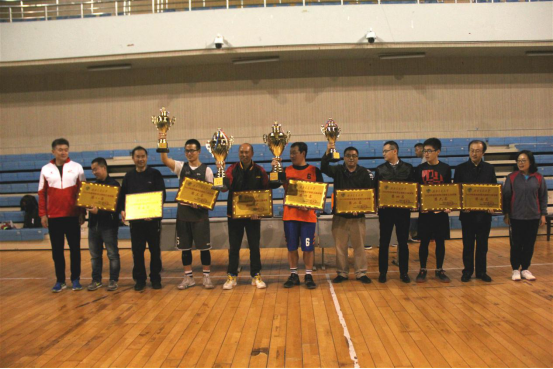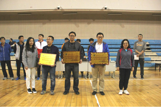 紧接着,校工会主席郑江和体育部书记潘喆为本次比赛获得体育道德风尚奖的单位进行了颁奖,获得本次比赛体育道德风尚奖的单位有:物理科学与技术学院、工程训练中心、电气工程学院、数学学院、后勤与基建管理处、公共管理学院。篮球协会副会长王齐荣教授和教职工篮协会长闻杨教授为本次比赛获得最佳组织奖的单位进行了颁奖。获得本次比赛最佳组织奖的单位有:地球科学与环境学院、远程与继续教育学院、体育部、校机关、机械工程学院、外国语学院。