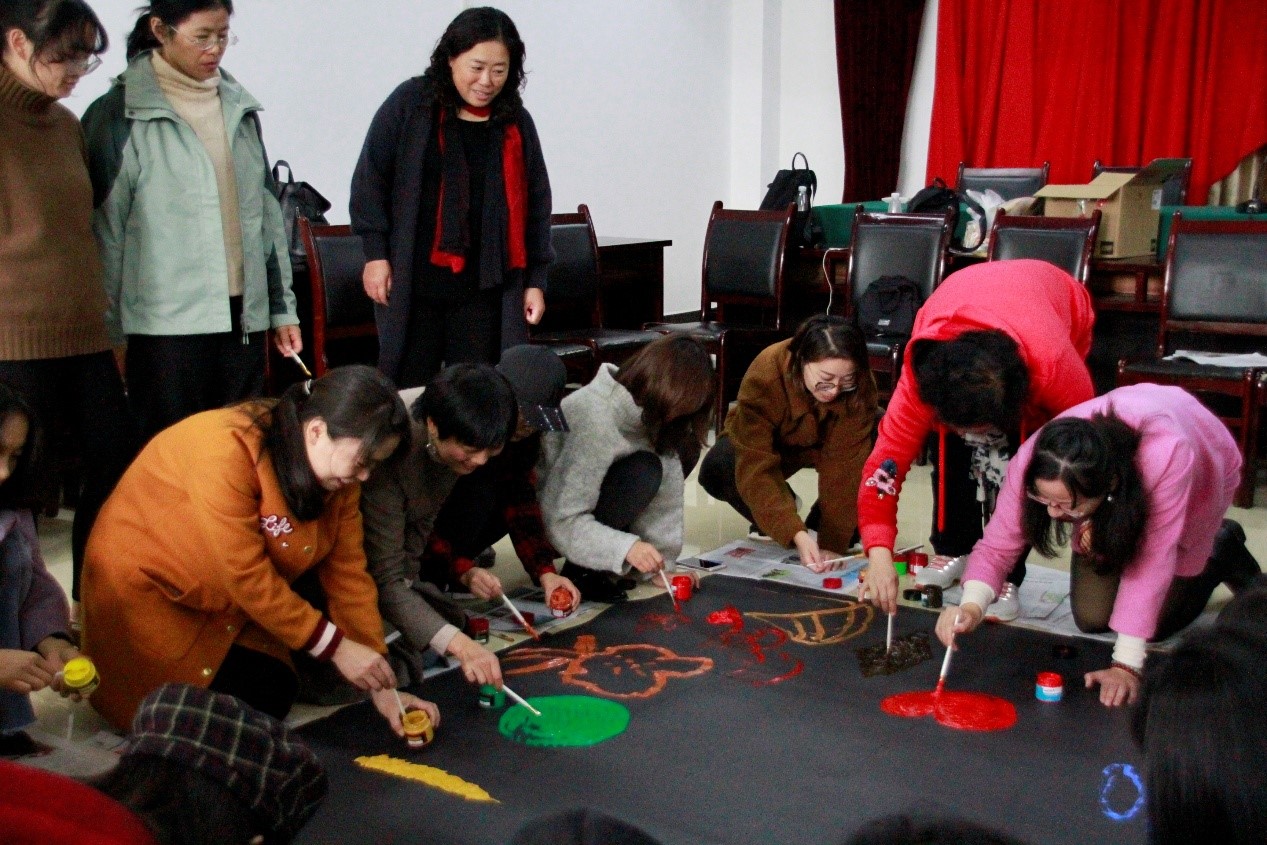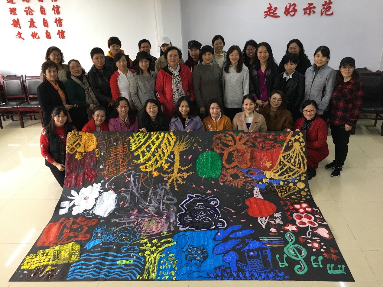 接着,在极富心理咨询经验的张学伟老师引领下,活动有序展开。先由老师们选择一种颜色代表自己的家乡,说明原因之后,在黑卡纸上作画,直到用尽此种颜料为止。画作完成后,再由老师们分享自己所画、所想并对画作作出评价,在互相的交流沟通中,大家彼此都放下了拘束,积极地进行了互动。随着活动的深入,张老师对画作又进一步的进行了科学的分析,专业的解读,让老师们在轻松愉悦的环境中收获了满满的快乐。