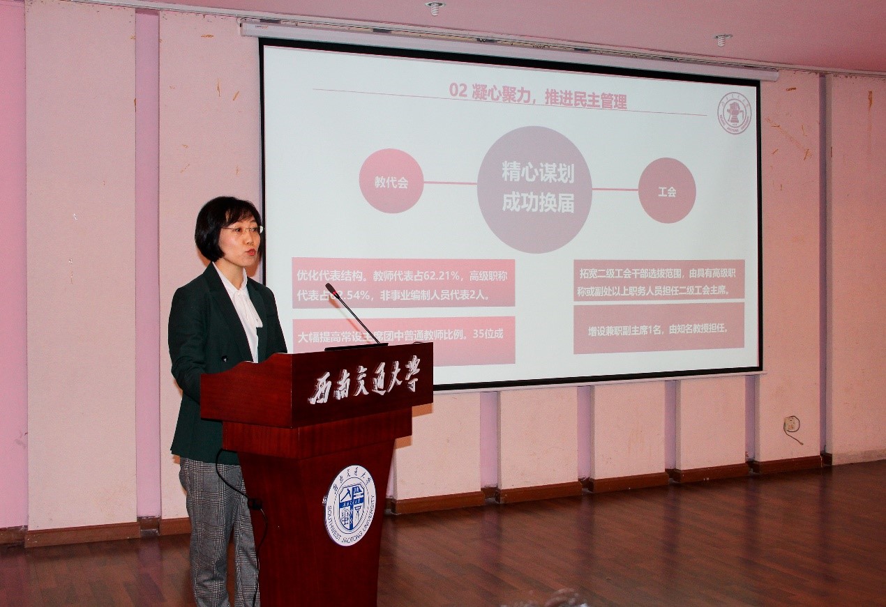 当天下午,会议进入第四阶段,四所交通大学的二级部门工会主席就学院层面的工会工作进行了研讨交流:上海交大机械学院工会孟雁主席作《服务院为实体,发挥工会作用》,西南交大原心理中心工会黄祥主席作《以心灵驿站为依托,构建教职工心理服务体系》,西安交大化工学院工会邓建强主席作《工会组织做好服务非在编职工工作的思考》,北京交大电气学院工会于金凤主席作《工会让生活更美好》的主题发言。