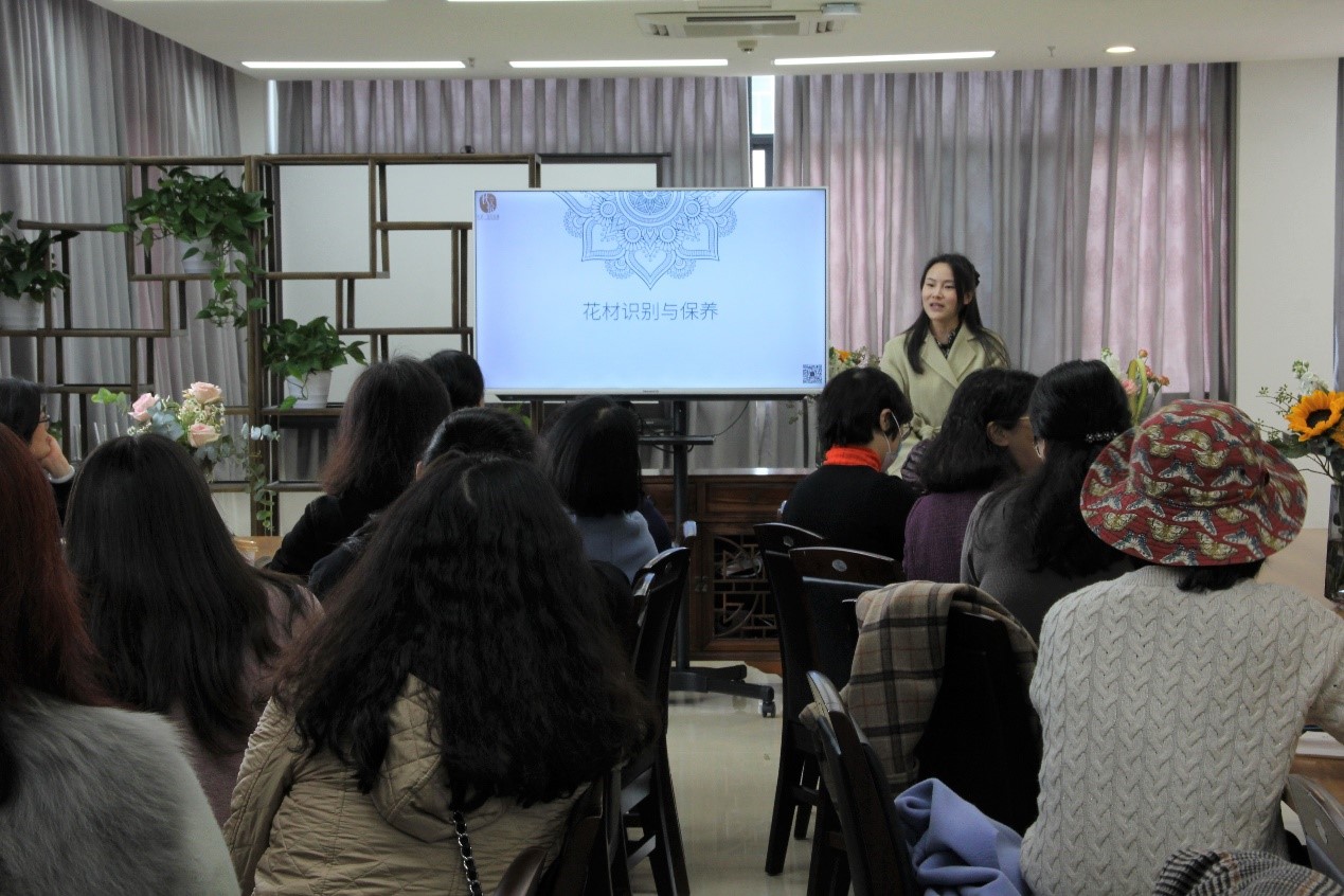 首先,李老师对花材分类和鲜切花应用进行讲解。随后李老师向大家展示了不同颜色玫瑰花的学名、别名、商用名以及花语,并用贴切生活的案例为大家讲解不同花材的花语的区别和用法。接着李老师向大家讲解了采购注意事项、采购后处理方法、平日维护方法和日常养护小方法,并向老师们传授日常生活中常见的花材的特殊养护方法。最后李老师简单讲解了花艺工具的使用和花艺作品的色彩搭配方法和注意事项。