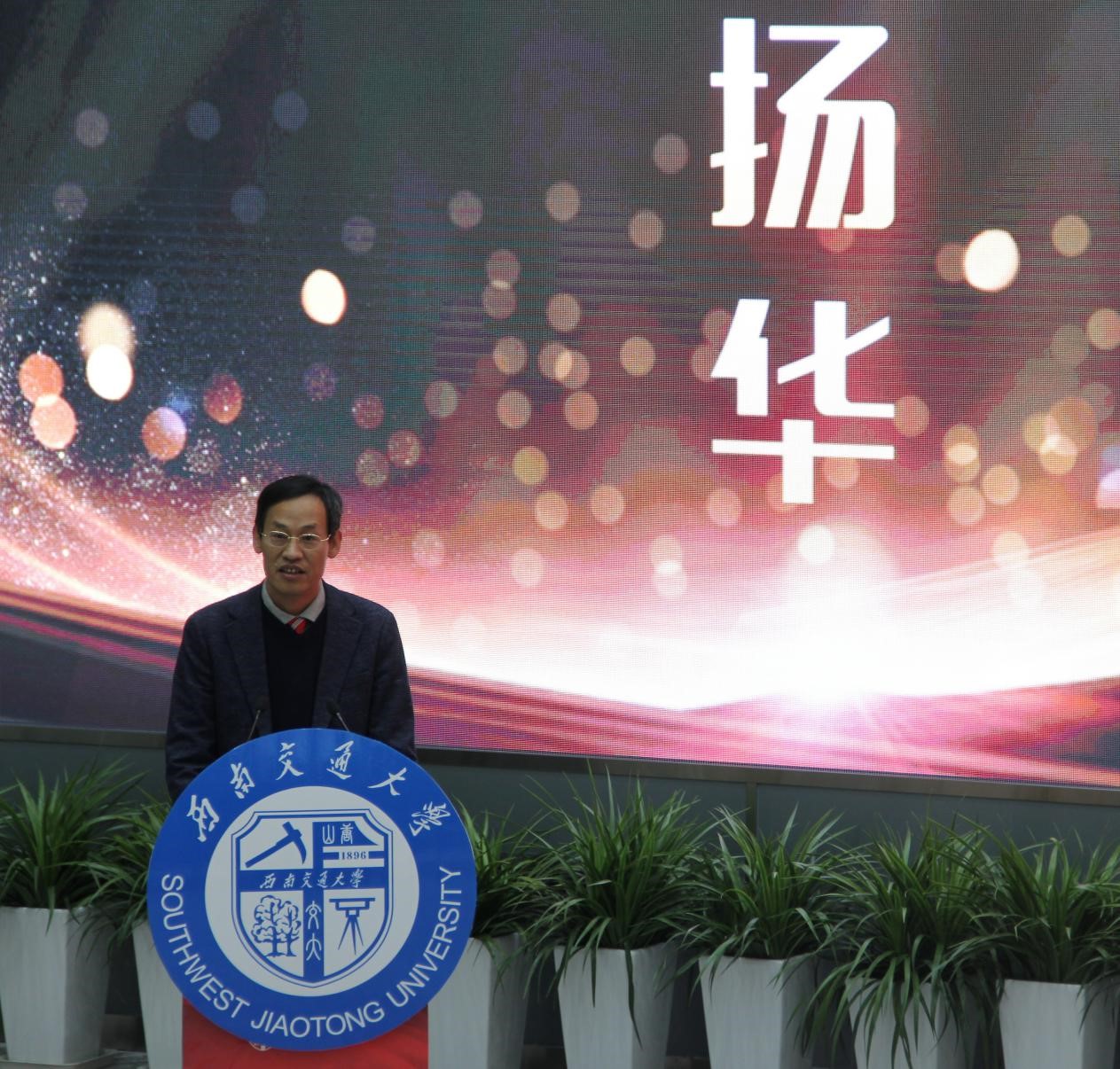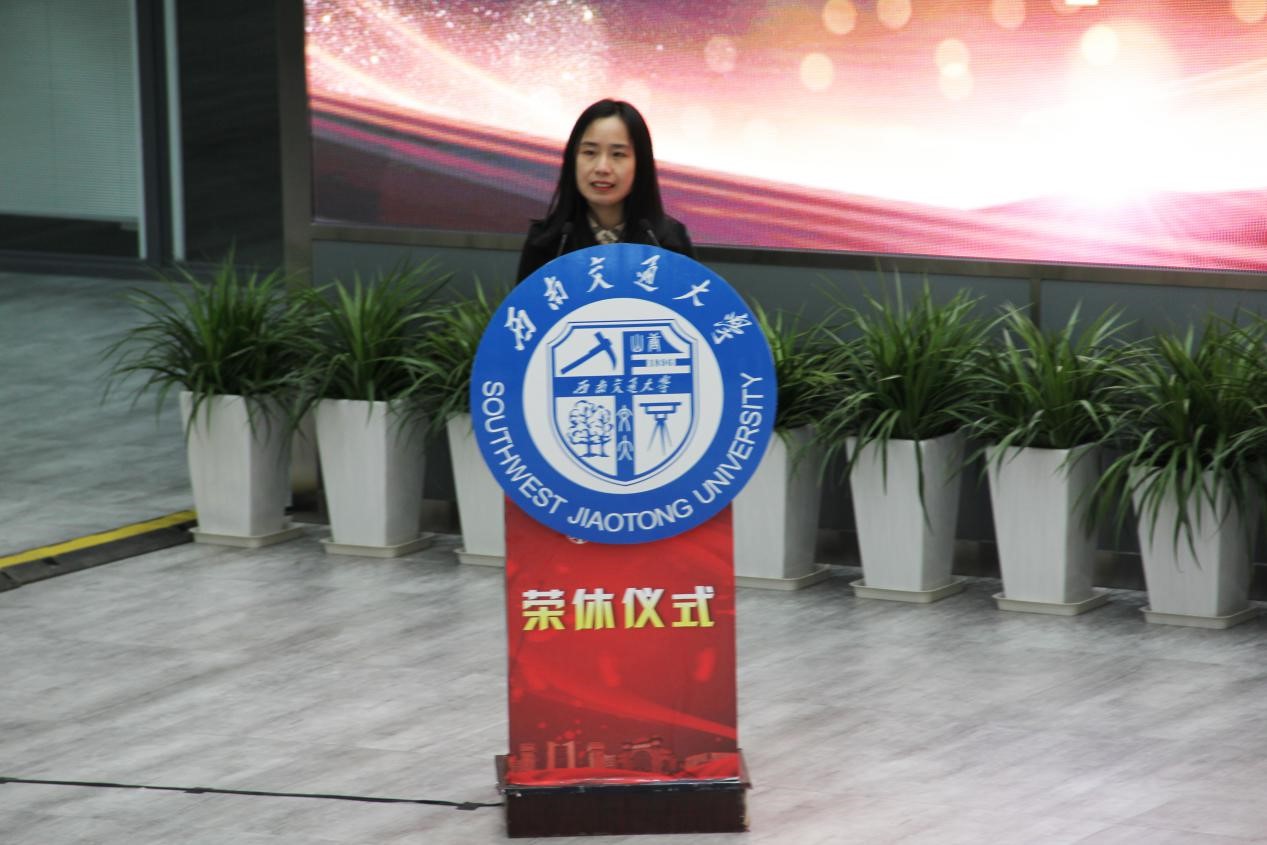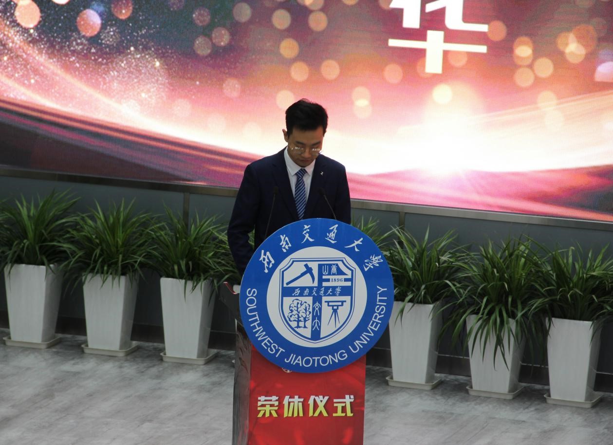 仪式进行第六项:青年教师代表发言。来自土木工程学院的青年教师袁冉发表了自己对于学校的美好祝愿。2014年从异国他乡回到阔别五年之久的成都,袁老师在土木学院老师的带领下迅速成长。从工作到生活,从科研攻坚到为人处世,袁老师说学校都给予了她最大的帮助,并在空间上和时间上都给予自由,这让她在个人成长、教学以及科研工作上都取得了极大的进步。国之重器,教育为本。最后,袁老师忠心地致谢为交大发展的各位长辈们,并表示像自己一样的青年教师定会接稳复兴交大的接力棒,成为交大和祖国的骄傲。