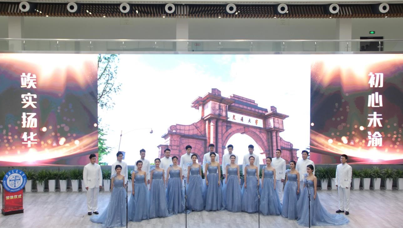 仪式进行第十项;大学生艺术团合唱《给您的歌谣》。这首歌由桂富强副书记作词,曲调悠扬,歌词朗朗上口。生动地体现了教职工在交大生活的点点滴滴,他们奔波在成都峨眉之间,实验室深夜的灯光,讲台上认真的板书,都是他们为交大所付出的青春印记。艺术团同学们饱含深情的演唱配合大屏上的一桢桢画面,让在场来宾为之动容,将本次仪式推向了高潮。