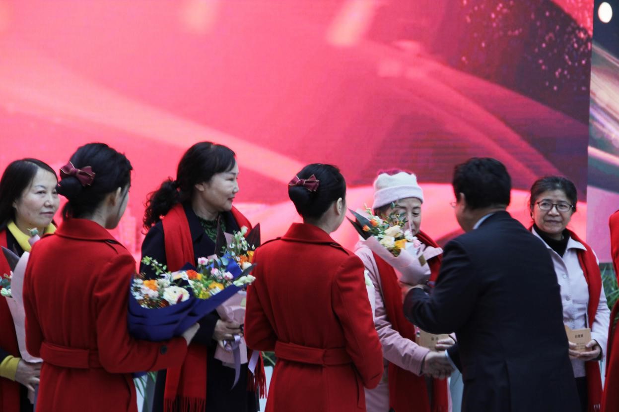 仪式进行第四项:校领导为参会荣休教职工颁发纪念铭牌并合影。参加本次仪式的荣休教师被分为三组,依次前往活动厅中央接受纪念铭牌的颁发,同时学校还为每位荣休的教职工准备了礼品以及捧花。一束束捧花,一条条红围巾,一块块铭牌,一张张笑容洋溢的面庞,汇聚成了交大对退休教职工的敬重以及退休教职工们对交大的留恋。
