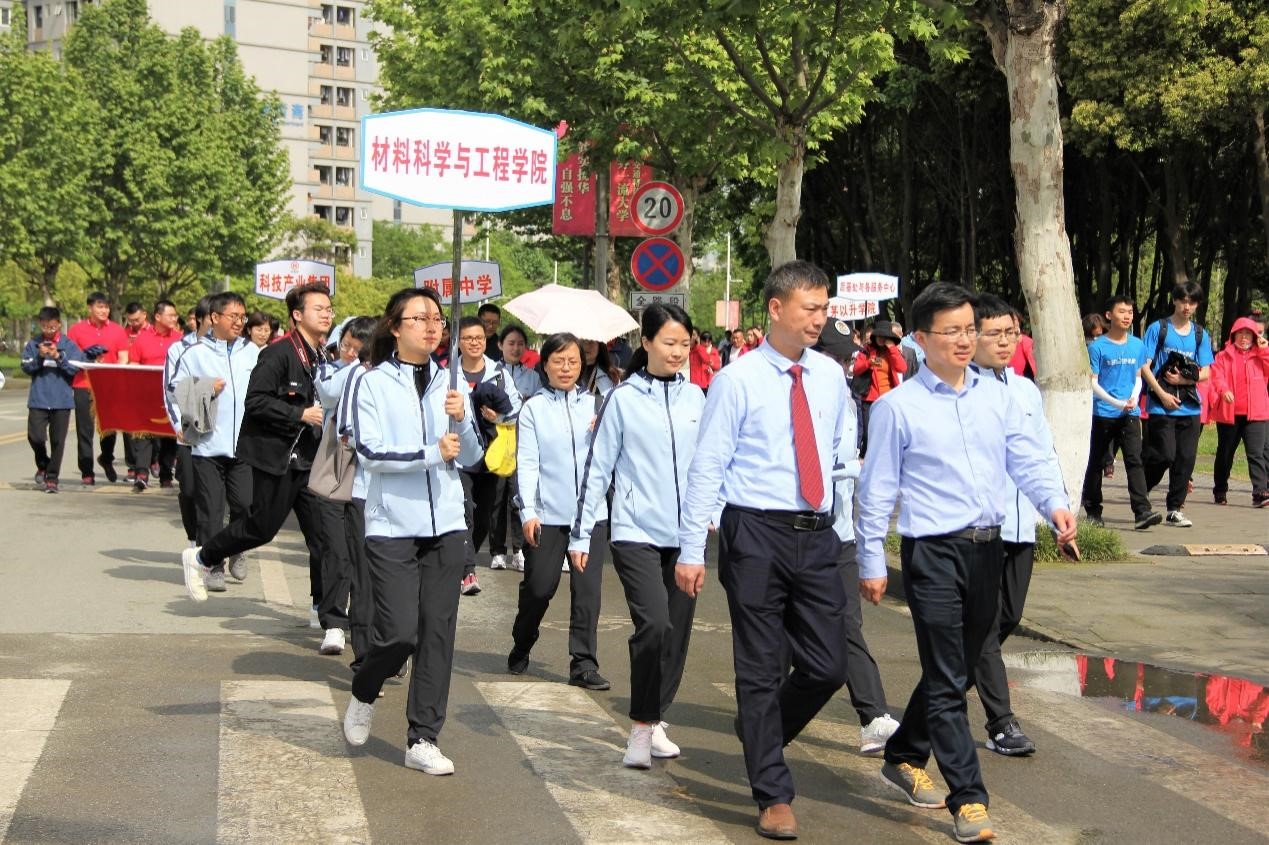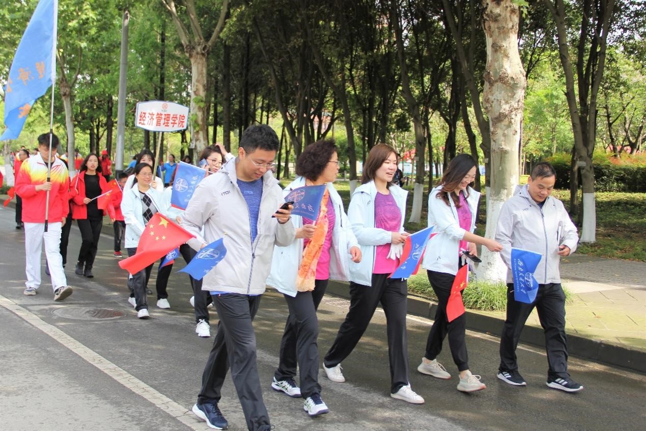 活动伊始,best365英国在线体育党委书记王顺洪、副书记桂富强、副书记张学龙、副书记沈火明、副校长蒲云、副校长冯晓云、副校长姚发明、副校长周仲荣等校领导带头开启了健步走活动,参加第121届运动会开幕式的师生紧跟其后。本次健步走活动以犀浦校区北区体育场为起点、竢实扬华墙为终点,沿途设有党史知识宣传标语指引道路,并请志愿者维持秩序,以确保师生安全。