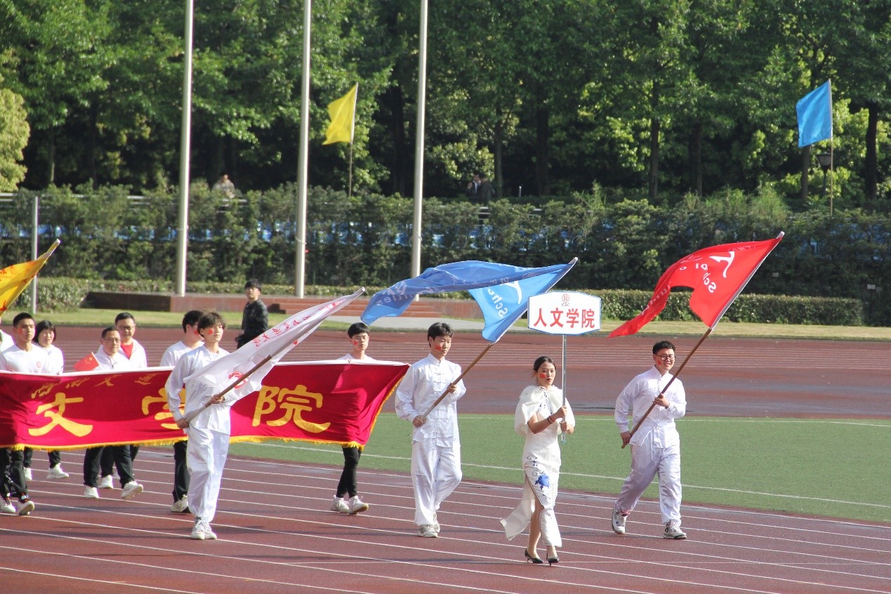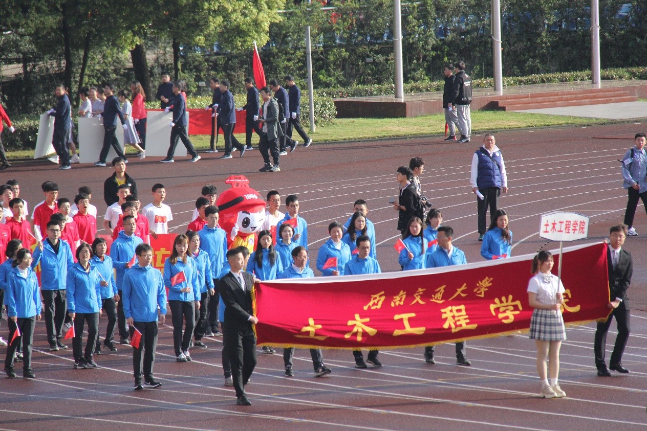 百年峥嵘,中国共产党恰是意气风发;竢实扬华,交大人携手奋进共谱新篇!伴随着校歌的悠扬旋律,各二级学院等参赛单位方队依次入场,彰显了我校不同学科及单位的独特风采。首先入场的是本次运动会的“公平使者”——裁判员队伍,他们当中有执法奥运会、世锦赛、军运会、世界大运会、亚运会、全运会的国际级、国家级和一级裁判员,他们顶烈日抗寒风,助力每一位学生成为德智体美劳全面发展的交大人。紧接着,土木学院用青春洋溢的歌舞表达了对党的百年华诞的诚挚礼赞,他们是教育部党建双创标杆院系,不忘初心,牢记使命,以优异成绩向建党百年献礼。作为具有交通特色的双一流院校,交通运输学院在我校学科建设和发展中占据重要地位,回首65载岁月,交运人奋力拼搏,求实进取;展望崭新征程,交运人斗志昂扬,豪情满怀。他们的方阵带着“交通强国,奋勇争先”的豪迈向主席台走来,他们步伐铿锵,展示着交运65载春秋沉淀的气魄,奏响了交大125次花开的华美乐章。以美育人,以文化人,我校人文学院方阵意气风发、激扬文字,整齐有力的步伐,踏出了他们团结奋进的斗志;手中飘扬的红旗,连成一片爱国爱党的赤诚心海。各学院及二级单位方队异彩纷呈,用铿锵有力的步伐、激昂嘹亮的口号为中国共产党成立100周年和我校建校125周年献上最美好的祝愿!