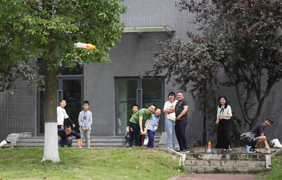 水火箭制作小组的孩子们完成火箭制作后便来到了工训中心楼下的草坪上开始实践发射,孩子们一个个卖力地使用着打气筒,家长们也帮助着孩子们“发射火箭”。不一会,孩子们的“火箭”纷纷飞上了天空,草坪上孩子们和家长们的欢声笑语此起彼伏。回到蓝牙音响小组,小组的家长和孩子们依旧细致认真地进行最后的组装工作,由于时间问题,有些蓝牙音响还没有最后的组装完成,但是孩子们都从此次活动中收益颇丰。