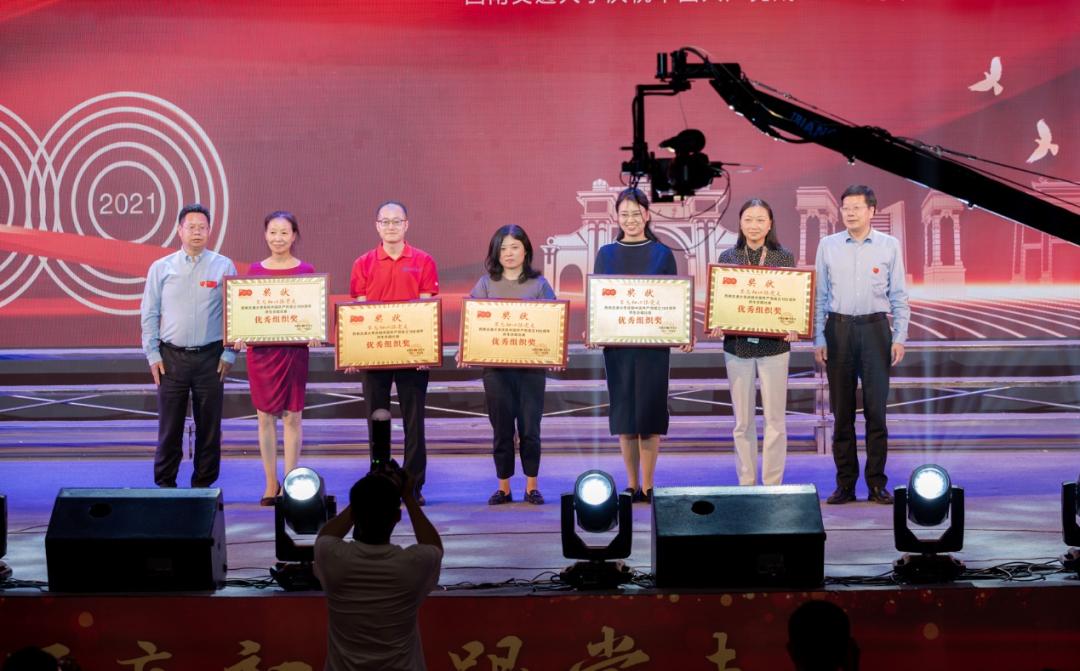 聚乐坛、忆峥嵘岁月,齐高歌、颂辉煌历程,今天,我们在这里忆伟大征程,为时代赞歌。在校工会郑江主席宣读比赛成绩和获奖名单后,我校桂富强副书记、张学龙副书记、沈火明副书记、朱健梅副校长、姚发明副校长,为本次比赛的获奖单位进行颁奖。