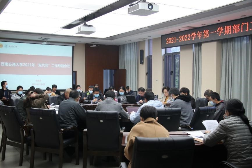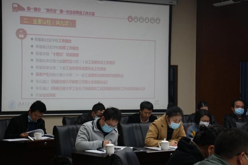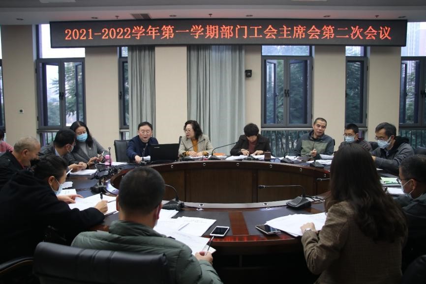 在工作组内部、校院党组织层面的布置工作顺利完成后,次日上午9点,2021-2022学年第一学期部门工会主席会第二次会议在综合楼269会议室召开,这也是“双代会”工作专题布置会。与会成员有校工会主席郑江、副主席喻碧君、副主席李煜宏及各部门工会主席,会议由李煜宏副主席主持,从工会层面,着重布置了校院两级“双代会”换届工作。