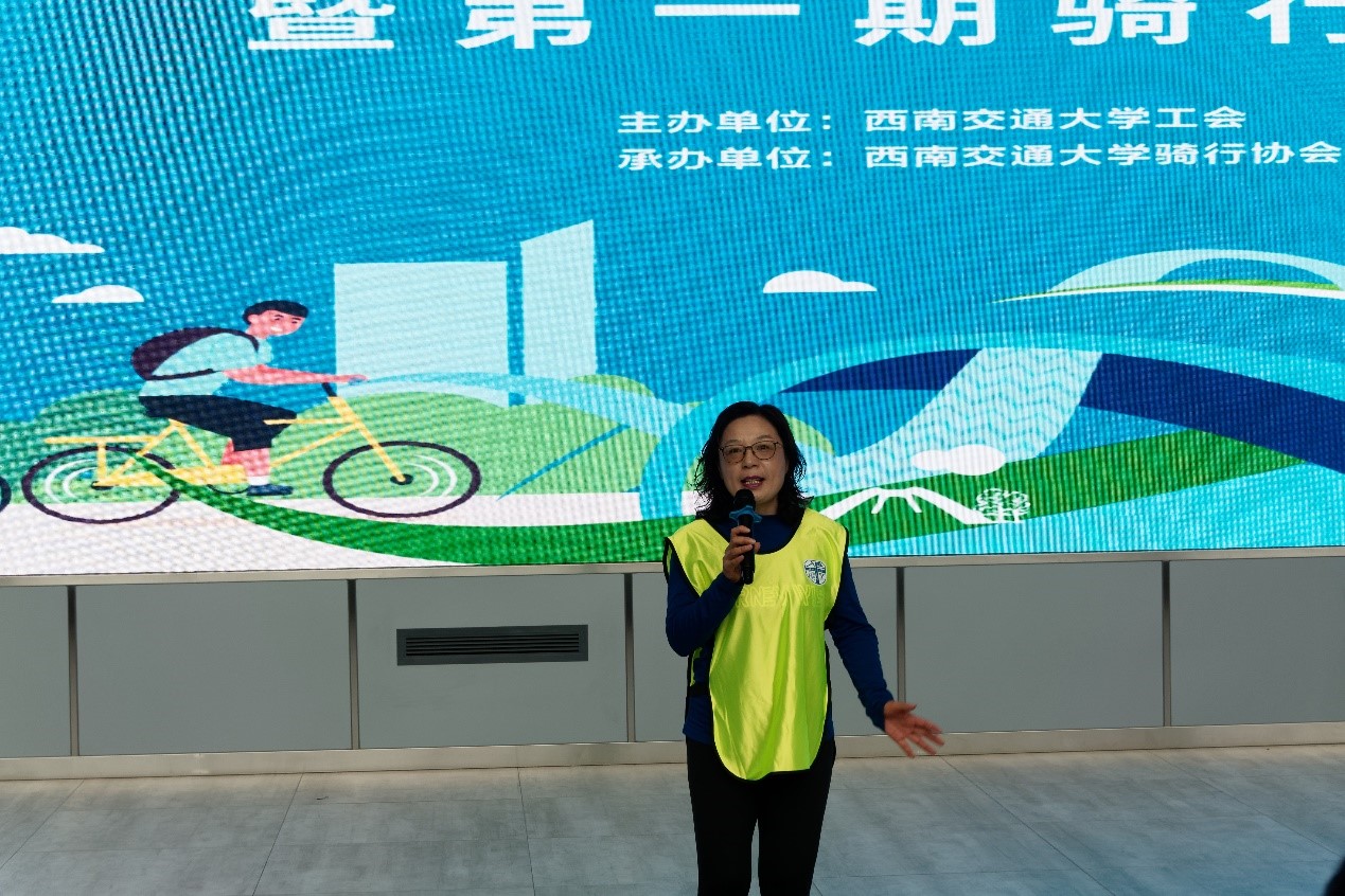郑江主席宣布骑行协会成立,并向雷叙川老师授予会旗。她在致辞中讲到,经过共同努力,协会把成都最近大火的“新铁人三项赛”之环城绿道骑行引入交大,组织了本次绿色时尚、强体健心、增进友谊、欢乐多多的公园城市骑行观览活动,开启了骑协活动的新篇章。希望老师们通过参与骑行,成为健康生活方式的倡导者,丰富生活场景的探索者,高品质生活的追求者。校工会将大力支持骑协开展活动,欢迎更多的老师们参与骑行!