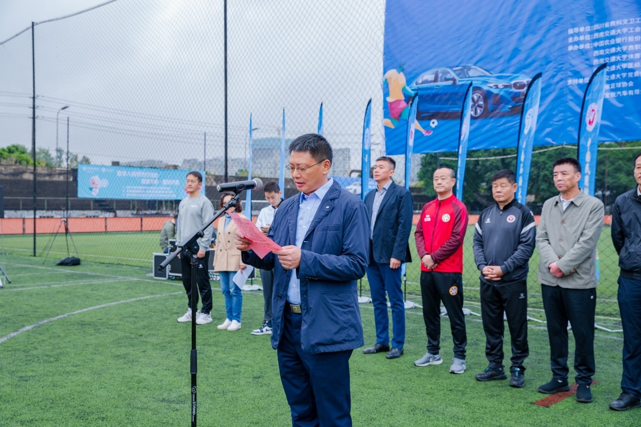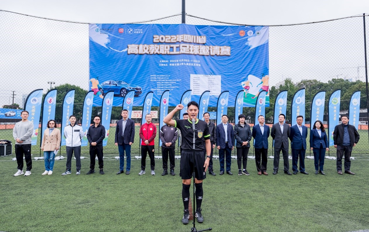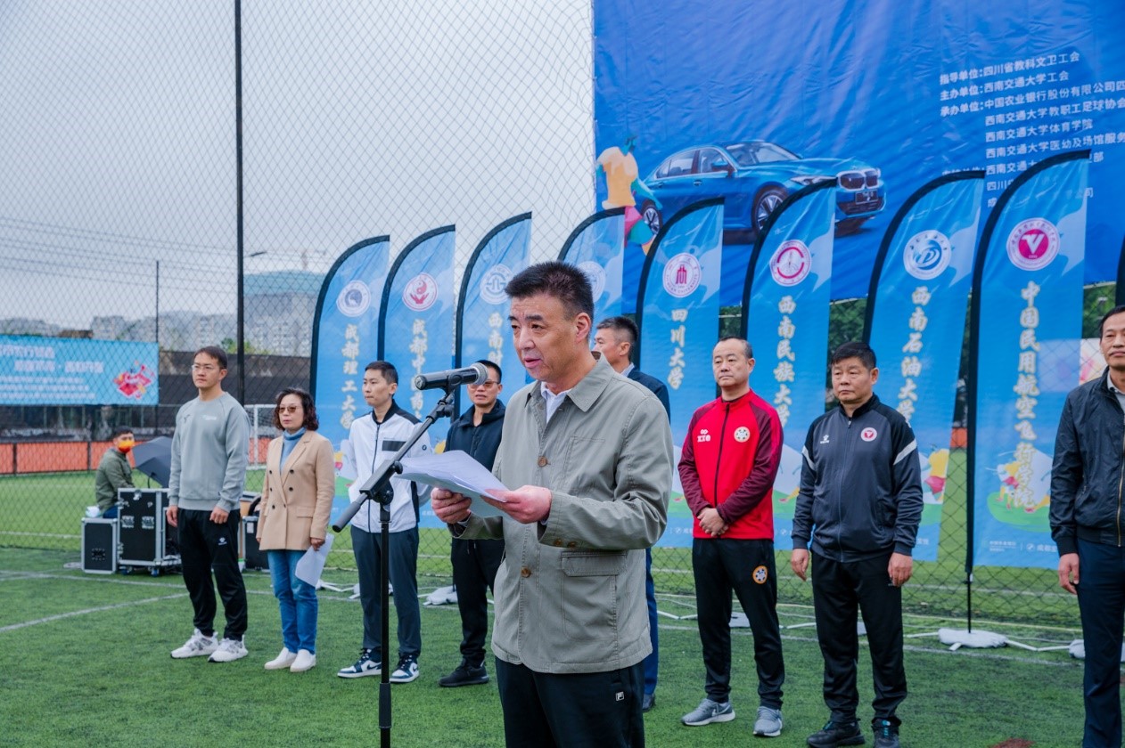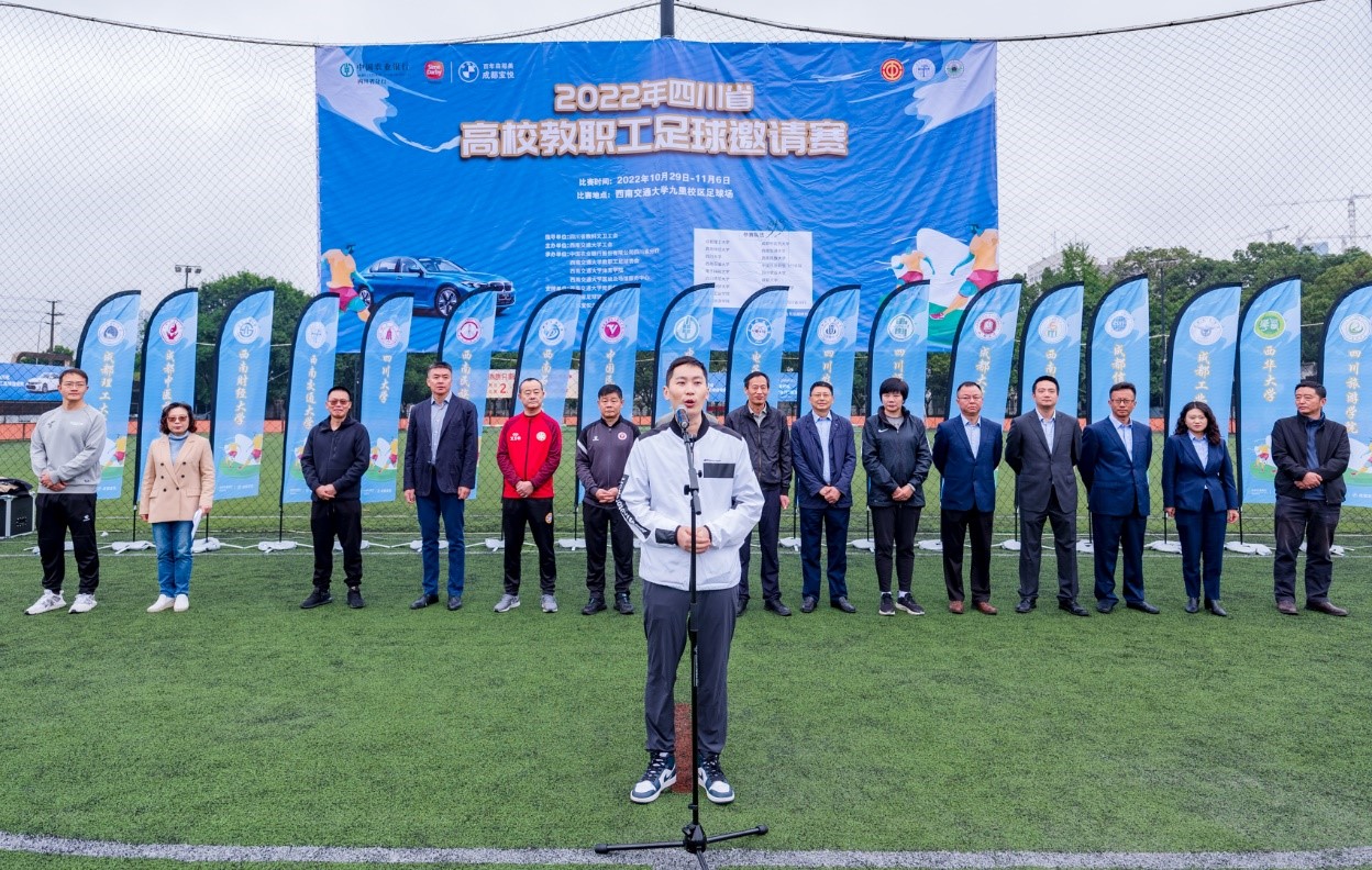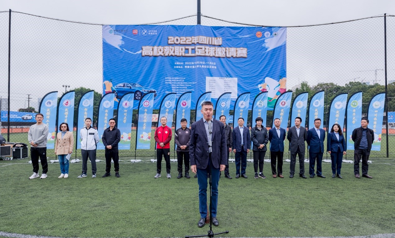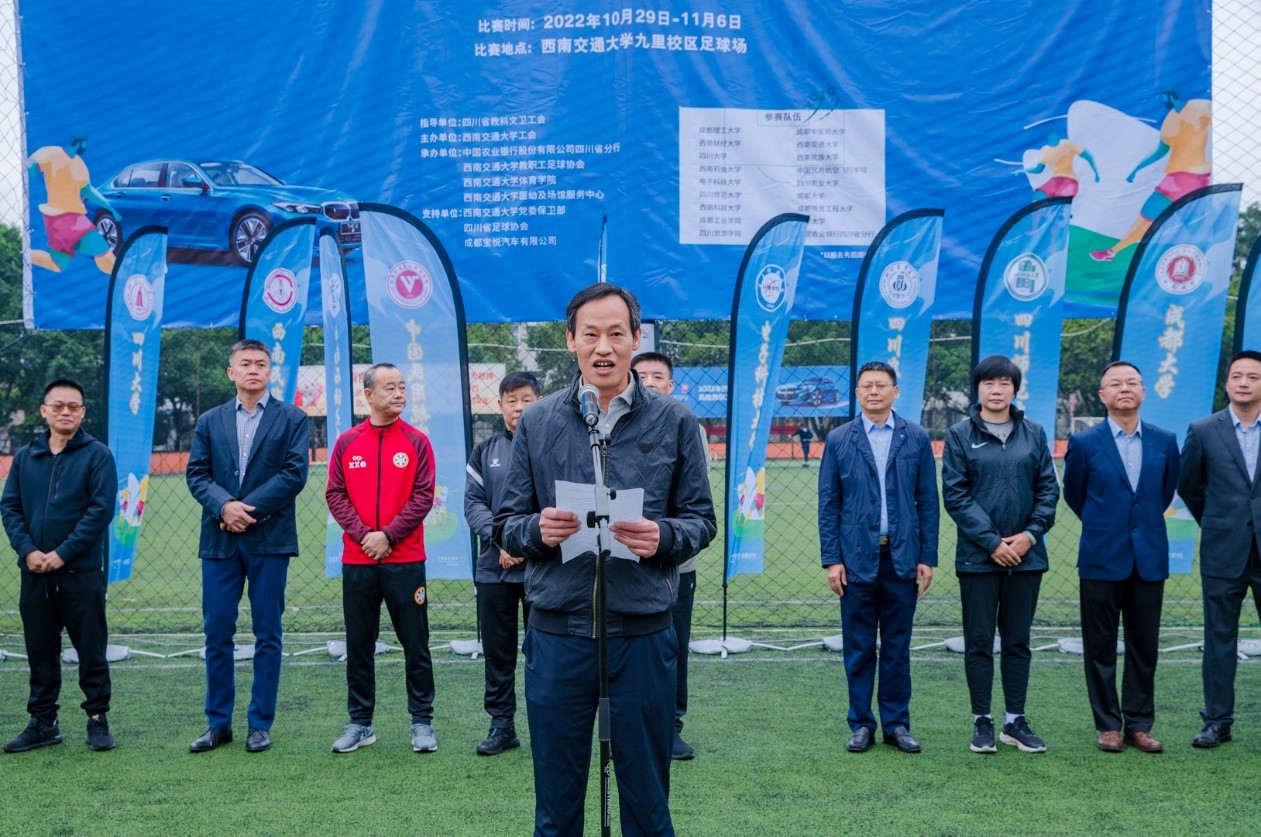 四川省教科文卫工会主席范会军为比赛致辞。范会军主席对参加比赛的各所高校和各位来宾表示热烈欢迎,对承办比赛的best365英国在线体育工会和交大教职工足球协会,以及支持比赛的赞助单位表示衷心的感谢。范主席讲到,今年为喜迎党的二十大胜利召开,深入实施教育强国,体育强国,健康中国战略,全省教科文卫系统开展一系列的职工群众性宣教文体活动,本次足球邀请赛就是其中重要的组成部分。他希望全体参赛运动员、裁判员和工作人员,坚持安全第一、风格第一、友谊第一、健康第一的原则,遵循公开、公平、公正的竞赛规则,赛出风格、赛出水平、赛出友谊、赛出精彩,充分展示四川省教科文卫体系中广大教职工努力拼搏、积极向上、奋勇争先的良好精神风貌;他希望广大教职工不忘初心,牢记使命,以昂扬的斗志,饱满的热情,强健的体魄投入到各自工作岗位,为全面建设社会主义现代化四川充分发挥教职工主力军的作用。最后,范主席祝本次足球邀请赛圆满成功。