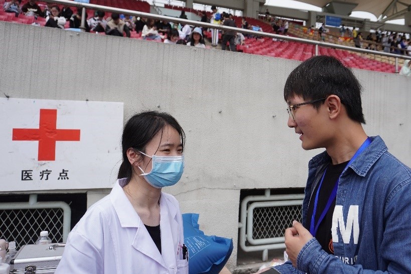 陈霜医生:我们主要准备了消毒和外伤处理的物品,以及一些应急抢救的设备,全程我们都会在这里保障师生们的安全,为他们高涨的参赛热情保驾护航。