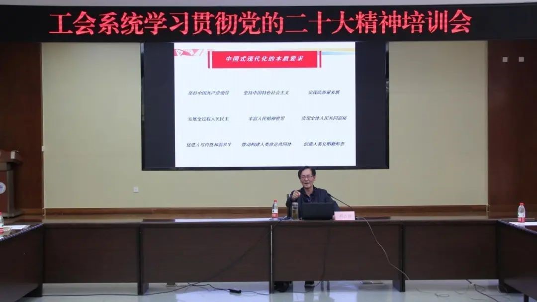 刘占祥教授以“自信自强、守正创新、踔厉奋发、勇毅前行——深入学习贯彻党的二十大精神”为题进行了辅导。刘教授首先介绍了党的二十大召开的背景,以及我们应该如何学、怎么学、学什么。刘教授重点围绕习近平总书记在广西代表团讨论时所强调的“牢牢把握过去5年工作和新时代10年伟大变革的重大意义,牢牢把握新时代中国特色社会主义思想的世界观和方法论,牢牢把握以中国式现代化推进中华民族伟大复兴的使命任务,牢牢把握以伟大自我革命引领伟大社会革命的重要要求,牢牢把握团结奋斗的时代要求”等五个“牢牢把握”,一一进行了详细阐述。刘教授通过大量的材料、数据,对比阐释,旁征博引,诙谐幽默,形象生动,深入浅出,深度解读。与会的同志们认为,听了刘教授的精彩辅导,进一步加深了对党的二十大精神深刻内涵的理解,收获很大,受益匪浅。并表示,将进一步加强党的二十大精神的学习,做好宣传,指导工作,见于行动。