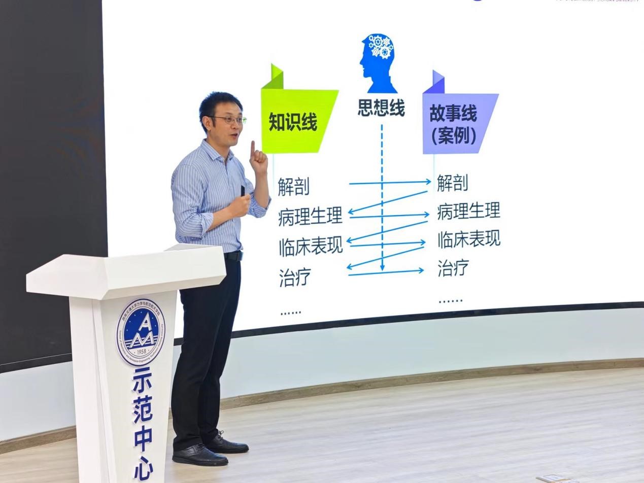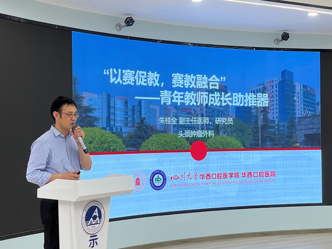 朱桂全老师向青年教师们作了题为《“以赛促教,赛教融合”青年教师成长助推器》的报告,分享了自己从2020年到2023年,从校赛、省赛再到最后的国赛的比赛经验。结合比赛过程中自身教学的四个阶段:从开始的“教无定法”阶段,授课注重形式;到后来的“教需有物” 阶段,授课重点向授课内容发生转变;再到“教有思想”阶段,授课更加注重课程的核心思想;最后发展为“教有理论”阶段,形成以理论指导为核心的教学创新,分享了自己在比赛过程中不断学习、不断总结的教学经验。