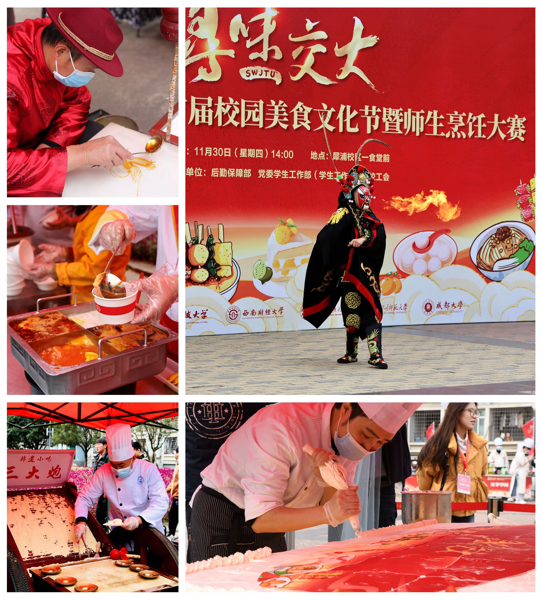 活动现场还为同学们准备了川剧变脸表演以及各种传统技艺和经典美食,如三大炮、糖艺糖画、关东煮、小汤圆、冷吃兔、干锅鸡等。此外,食堂的大厨们现场制作了交大定制款的大蛋糕,长1.8米、宽0.8米,供同学们品尝。