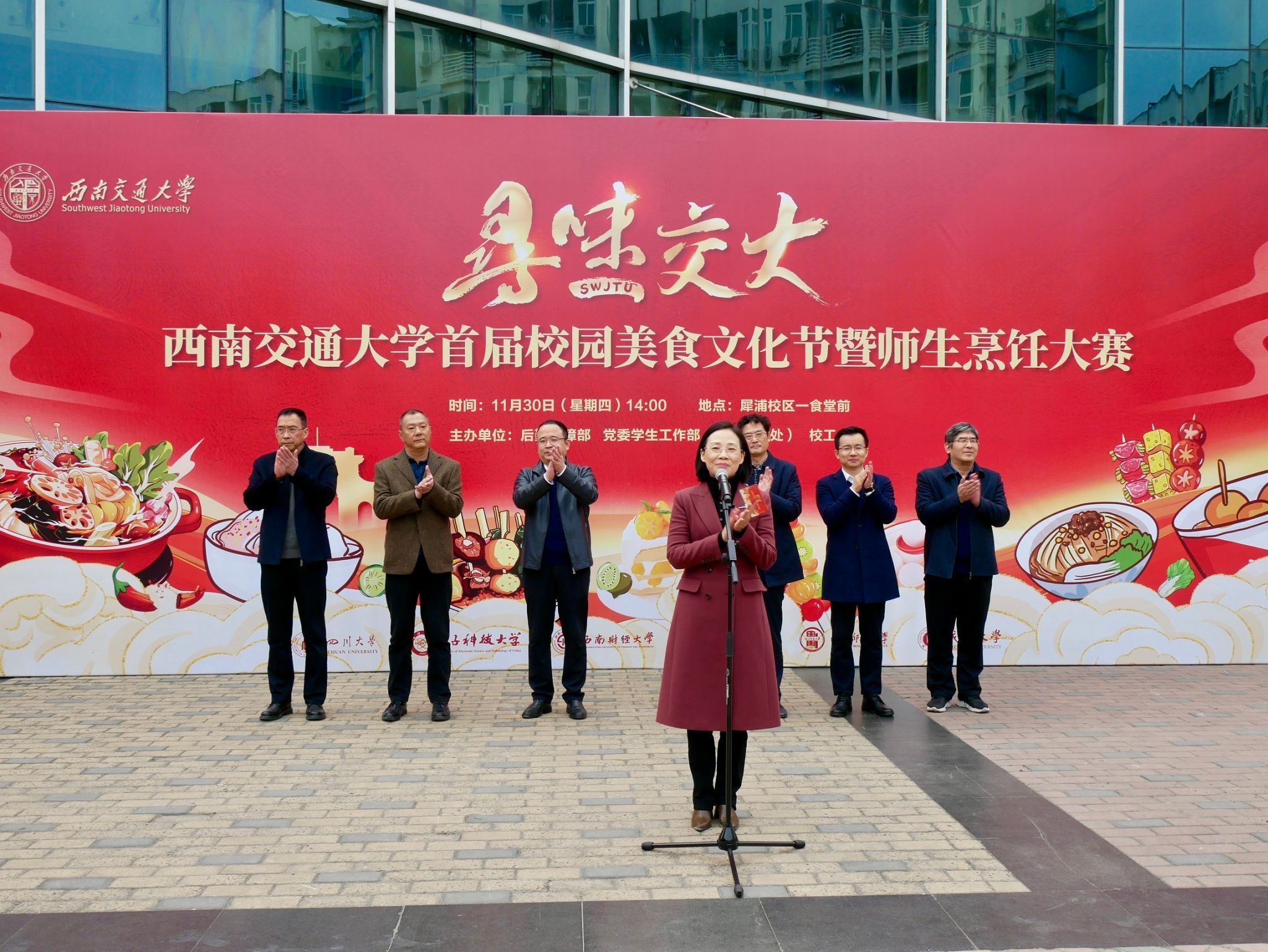 为弘扬中华美食文化,丰富师生校园生活,为全校师生奉上一场舌尖盛宴,促进师生互动交流,11月30日由后勤保障部、党委学生工作部、校工会主办的 “寻味交大”首届校园美食文化节暨师生烹饪大赛在犀浦校区一食堂前举行。校党委副书记杨爱华,后勤保障部、党委学生工作部、校工会等相关部门负责人,共近6000余名师生代表参加了活动。