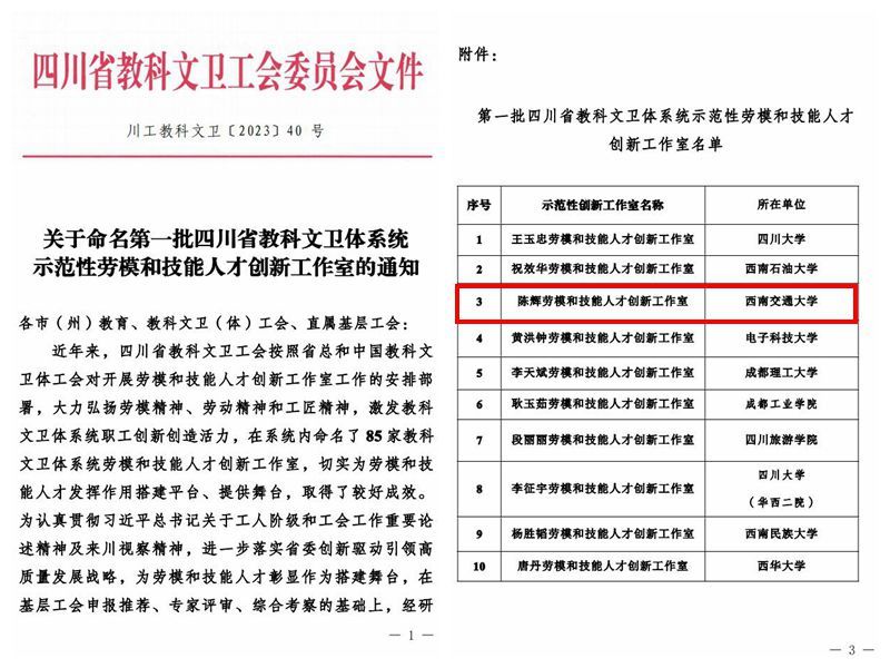 12月18日,四川省教科文卫工会在全省教科文卫体系统命名的 85 家劳模和技能人才创新工作室基础上,认定10 家为“第一批四川省教科文卫体系统示范性劳模和技能人才创新工作室”,我校材料科学与工程学院陈辉创新工作室名列其中,光荣登榜。