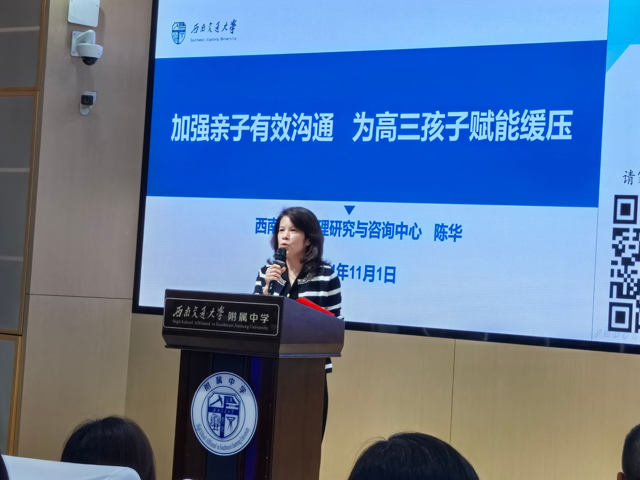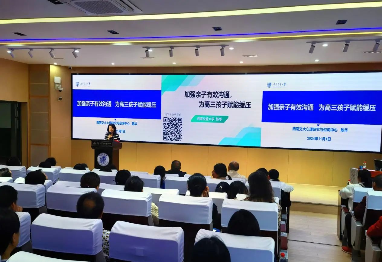 为进一步指导家长学习如何与孩子有效沟通,建立高质量的亲子关系,为高三学子赋能减压,11月1日,由校工会和心理研究与咨询中心主办的系列心理沙龙活动之一“高三家长如何进行亲子有效沟通”讲座,在交大附中报告厅举行。学校心理研究中心教授、硕士生导师、四川省心理问题干预专家组成员陈华主讲。活动由附属中学承办。