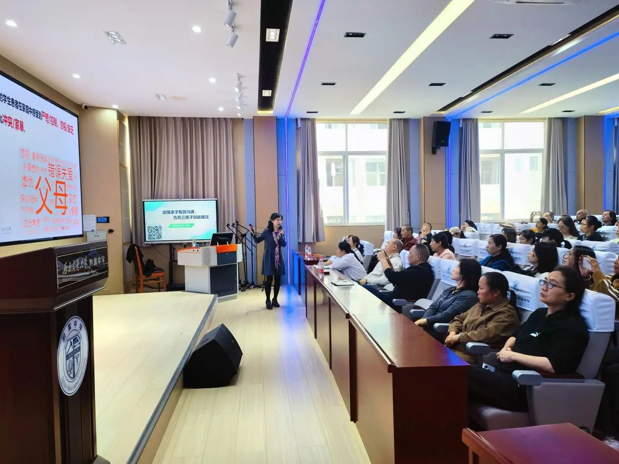 讲座前,附中德育处主任杨伶讲述了本次公益讲座的目的和意义,即聚焦于“亲子沟通”这个词,用沟通架起爱的桥梁,促进高三父母与孩子心灵的“双向奔赴”。