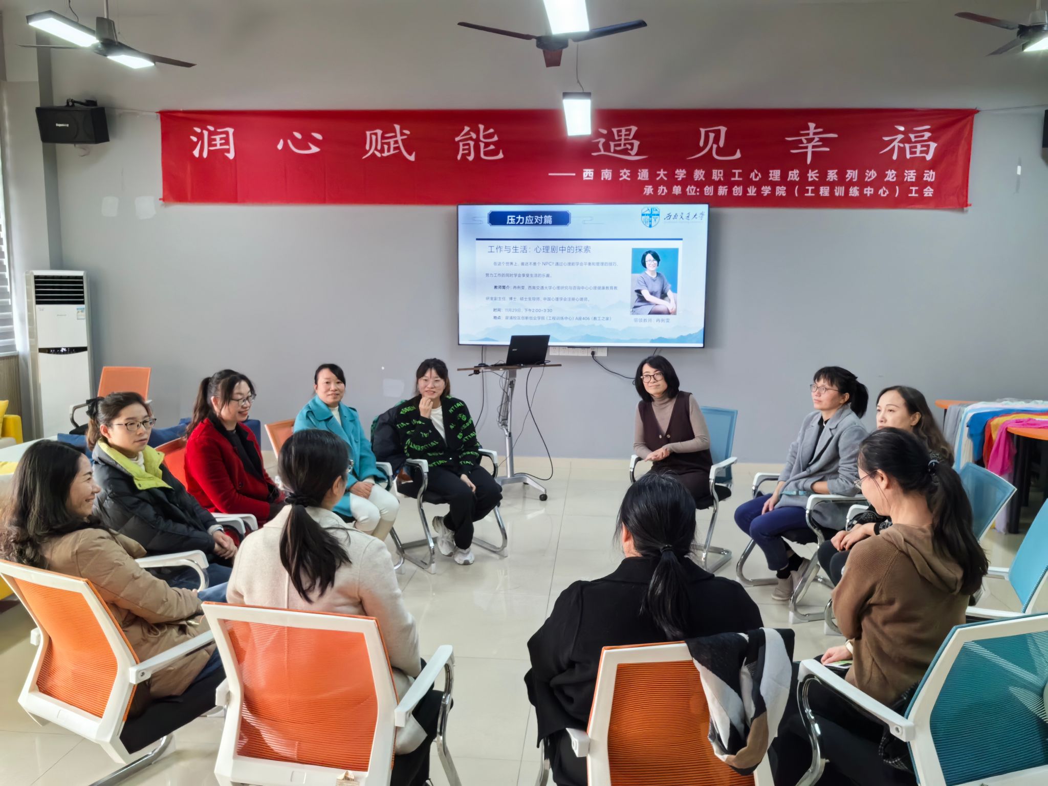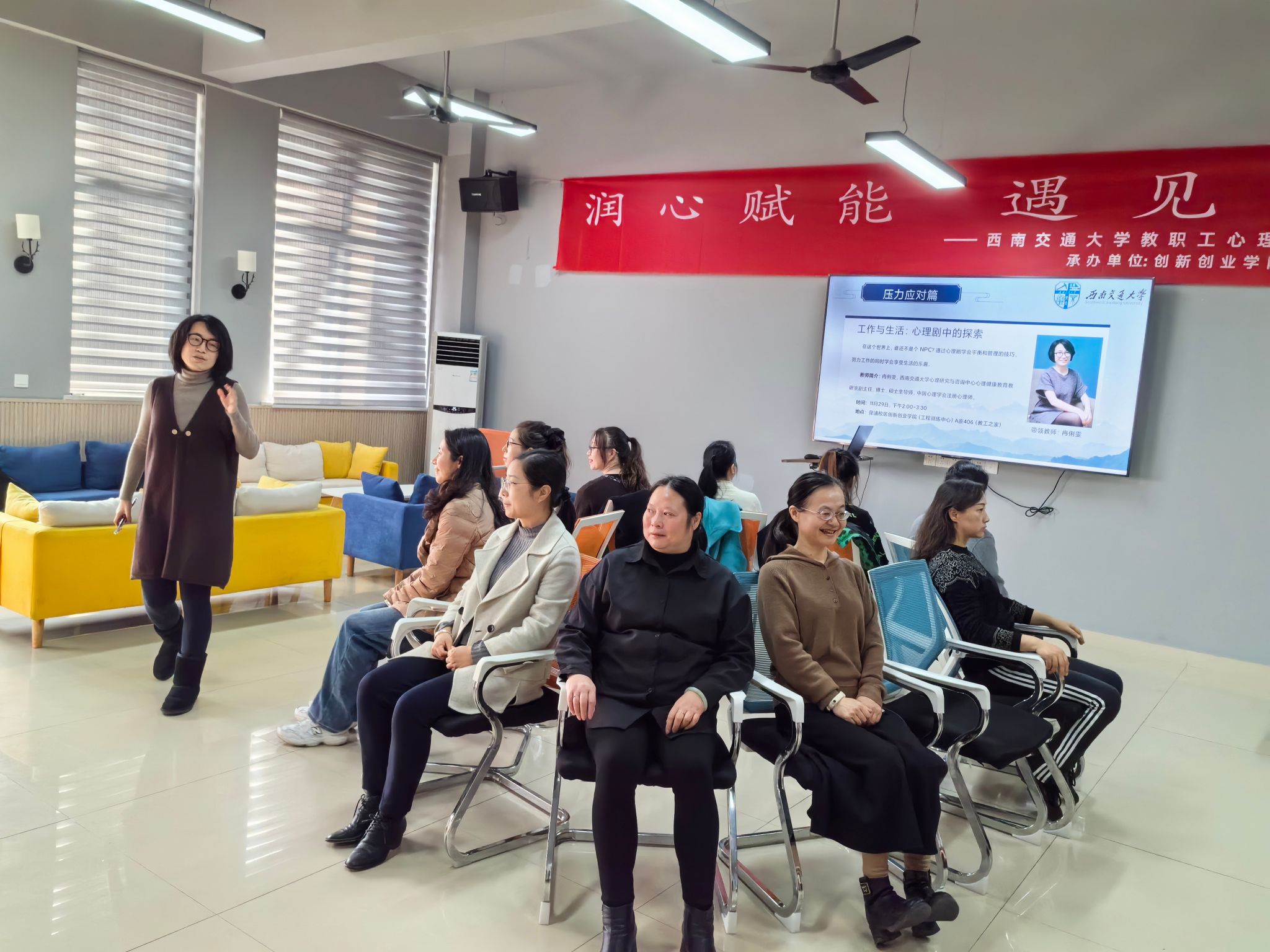 在生活的宏大舞台上,我们常常忙碌于各种角色的扮演,仿佛自己只是这个世界的“NPC”,被无形的压力与忙碌驱使着前行。然而,11月29日下午2:00在犀浦校区创新创业学院(工程训练中心)A 座 406室教工之家开展的一场别开生面的心理剧活动,却似一盏明灯,为人们照亮了平衡工作与生活的探索之路。