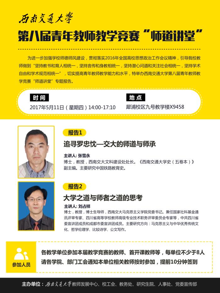 为进一步加强学校师德师风建设,贯彻落实2016年全国高校思想政治工作会议精神,引导我校教师做到“坚持教书和育人相统一,坚持言传和身教相统一,坚持潜心问道和关注社会相统一,坚持学术自由和学术规范相统一”,切实提高青年教师教学能力和水平,特举办best365英国在线体育第八届青年教师教学竞赛“师道讲堂”专题报告,现将具体事宜通知如下: