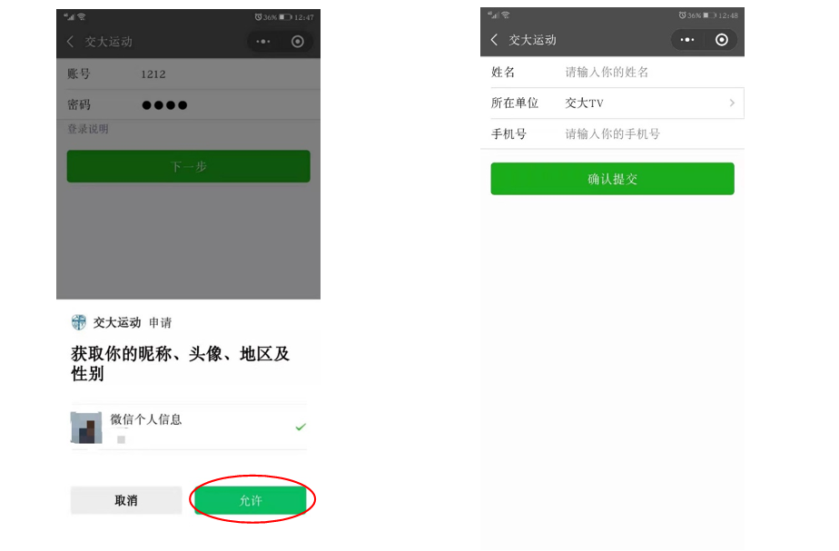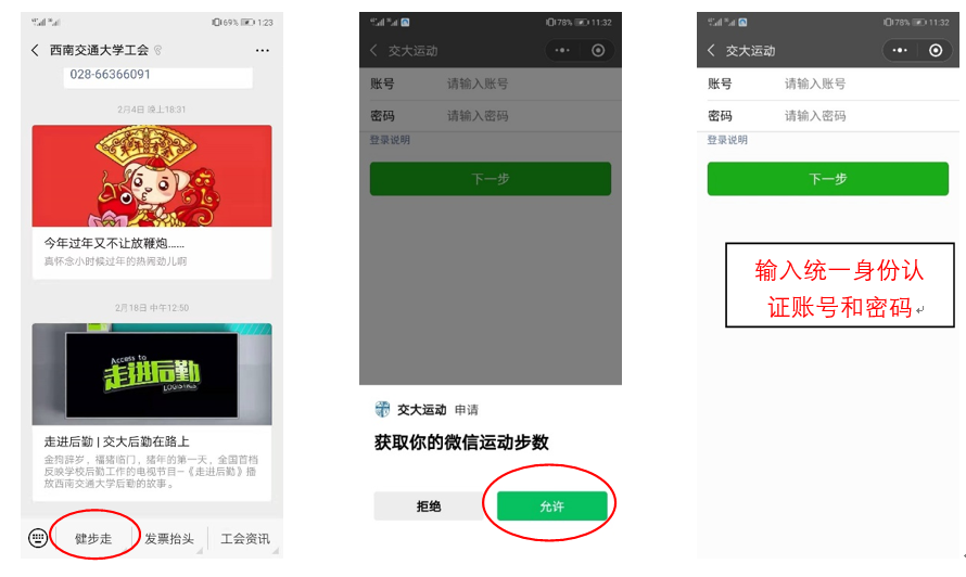 点击公众号“健步走”按钮进入“交大运动”微信小程序,当出现授权窗口时,点击“允许”来给小程序获取微信运动权限。