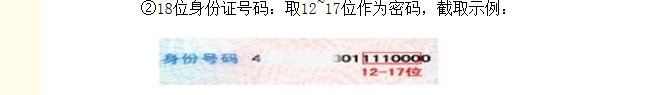 ②18位身份证号码:取12~17位作为密码,截取示例: