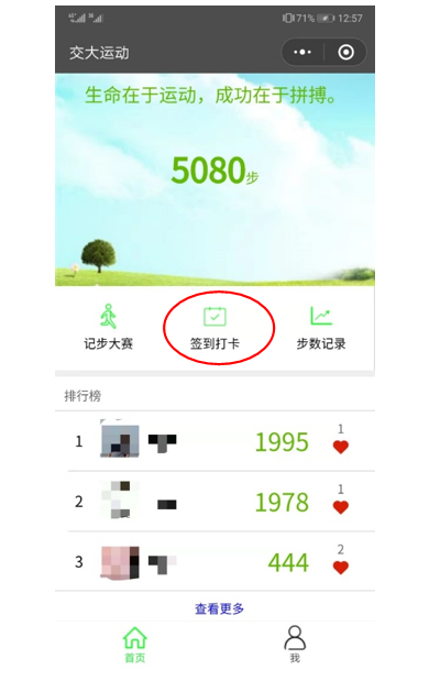 每天点击“签到打卡”即可完成签到上传实时步数,并显示实时排名情况。