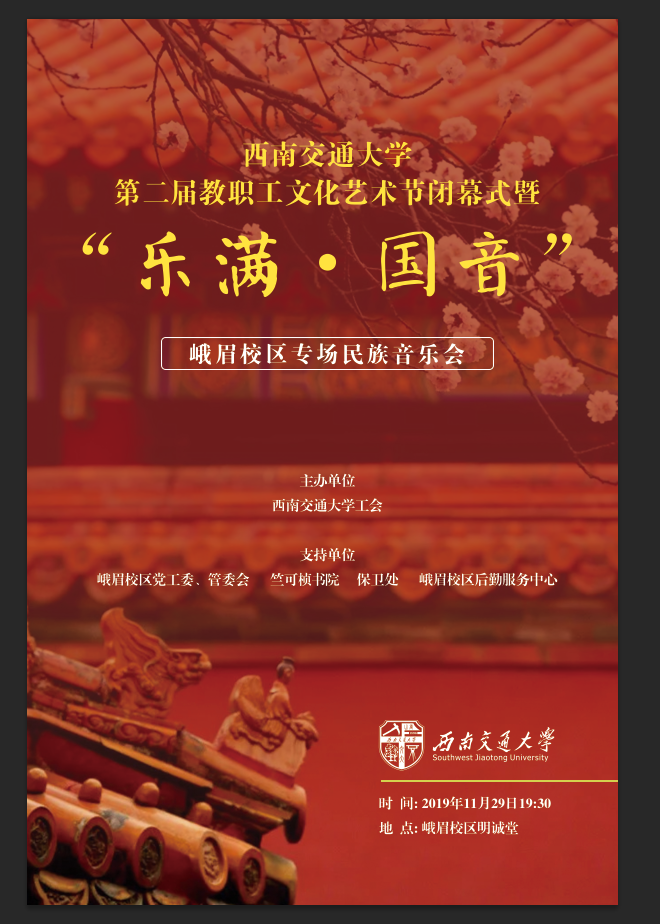 五千多年的灿烂文明发展所孕育的中华传统文化,沉淀着中华民族最深沉的精神追求,代表着中华民族独特的精神标识,是中华民族发展创新、继往开来的根基与血脉。孔子有云:“志于道,据于德,依于仁,游于艺。”临近庚子年,校工会特邀请成都民族乐团走进best365英国在线体育,为全校师生奉献一台精彩的演出,同时best365英国在线体育第二届教职工文化艺术节也落下了帷幕。