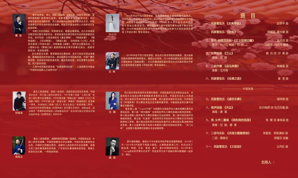 成都民族乐团成立于1985年7月,是我国西南地区从事民族音乐创作演出的具有代表性的专业乐团,先任乐团驻团常任指挥:曹波。乐团成立以来积累了大批古典、传统民间乐曲,并创作出一大批当代优秀曲目,其中不少作品在全国、省、市比赛中获奖。