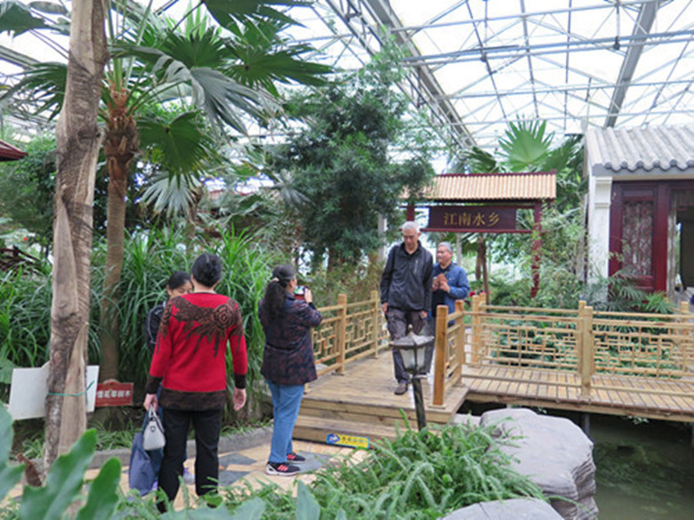 据介绍,汉园是一个全封闭的室内大包间,它采用了独特的双层纳米薄膜遮阳温控技术,电脑自动精确控制,使之能够在最低能耗下保证园内小气候四季如春;汉园因地制宜,就地取材,用深层三十米的地下水在整个室内场所地板下面循环往复,将大地母亲的温暖带给整个园内,不用空调也能四季如春。走进汉园,即刻感到它是一个很美的、充满厚重巴蜀文化韵味的园林。它以绿色景观植物为主,结合了假山、瀑布、小桥流水、竹木亭阁等园林景观,室内波光潋滟、花香幽幽、绿树掩映、光照柔和……许多老同志都不由自主地发出赞叹。沿着曲径回廊漫步,隆中对,仿佛让人回到桃园三结义和三顾茅庐;青梅煮酒,感受到处处流露的英雄豪情;老同志们流连忘返,不断地拍照留影,一个多小时过去了,大家才不舍地走出室内。