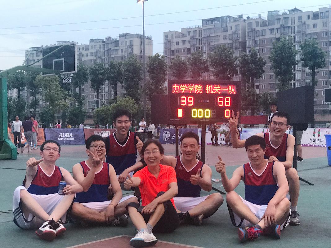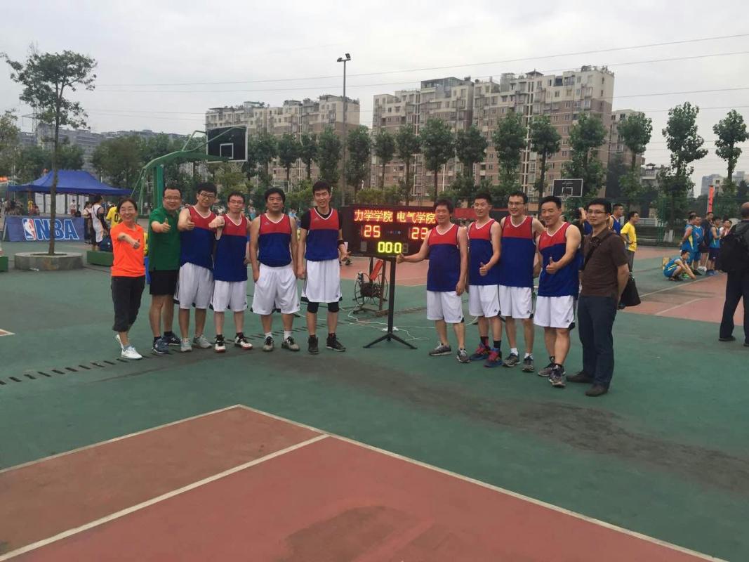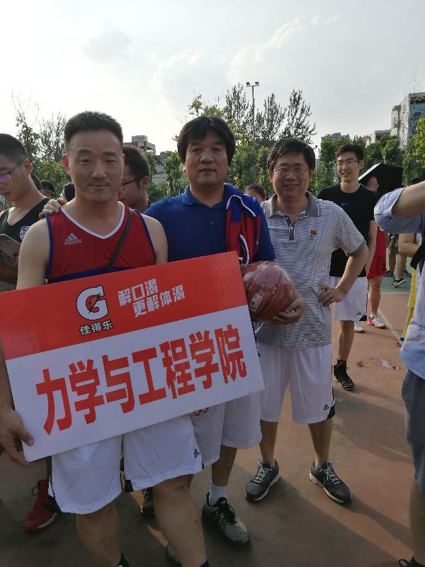 2017年6月6日在西南交大犀浦校区篮球场停摆十几年的教职工篮球赛终于拉开战幕。力学与工程学院在康国政院长和刘菲主席的组织和参与下组队参加了本赛事。我们被分在了C组,有实力强大的机关一队和后勤集团队。我们的队伍虽然年龄偏大,场上主力队员三位四十岁以上,但他们的球技不输给年轻人。康国政院长年轻时也是位篮球爱好者,近年来也长期坚持组织自己科研团队的老师和研究生进行篮球友谊赛,所以球感较好,并场场打满全场,可谓是绝对的主力。首场比赛对阵物理学院,40.5:20.5轻松拿下比赛。首场比赛的胜利给了我们些许的信心。第二场小组赛对阵实力强大的后勤集团,在后勤的严加防守下,我们打不出默契的配合,后勤队配合默契,很快控制了局面,最后我们不敌对手以12.5:30败北,比分意外悬殊,信心受挫。第三场对本组最强的机关一队,由于主力康院长有会不能参加,实力削减,替补上场,部门工会委员范晨光老师和新进老师胥奇老师有机会上场,他们表现神勇,超水平发挥,配合场上主力谷丽瑶、朱志武、储节磊很好地完成了比赛。小伙子们完全放开了,打得酣畅淋漓,最后居然拿下39分,虽然比赛输了,但虽败尤荣。周末休息后,迎来了最后一场小组赛,6月12日周一与电气学院争小组第三。刚开始我们打得比较紧,四比九落后。经过调整后,追上比分,上半场结束时比分持平。下半场比赛更加紧张,两队比分一直咬得很紧,交替上升,最后我们以25.5:23小胜,那到了预期的小组第三。