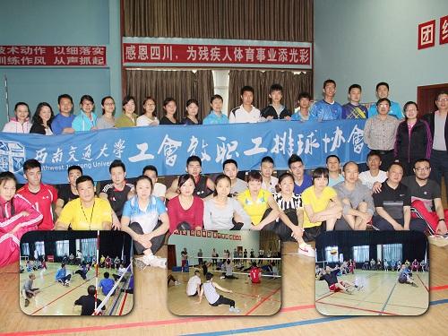 为支持四川坐式排球队奋勇拼搏,鼓励四川健儿发扬“汶川不哭、四川雄起”的精神,在国际级裁判、教职工排球协会刘江会长号召下,5月10日上午,校工会郑江副主席、朱宝宗教练员率领学校教职工排球协会一行22人走近温江区残联,与省坐式排球队进行了一场特殊的比赛——坐式排球赛。四川省坐式排球队隶属于四川省残联,曾经代表四川省参加过多次全国残疾人运动会,并获得优异成绩。