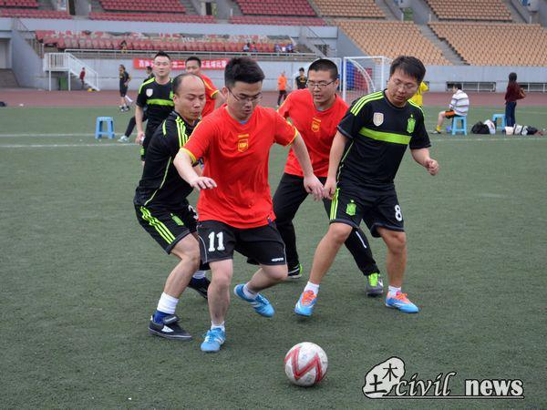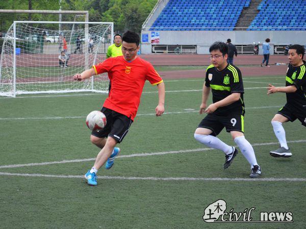 经过了3分钟的休整,下半场的比赛开始了。如果说上半场材料学院的老师以积极主动带动本场比赛的节奏,那么在下半场中,土木学院老师们则是牢牢的将比赛的主动权掌握在了自己的手中。在开场不到5分钟,就多次相互配合,向对方发起了猛烈地进攻,同时筑起防线守住了材料学院老师进攻。但对方延续着上半场的气势,与土木学院老师再次进入胶着状态。