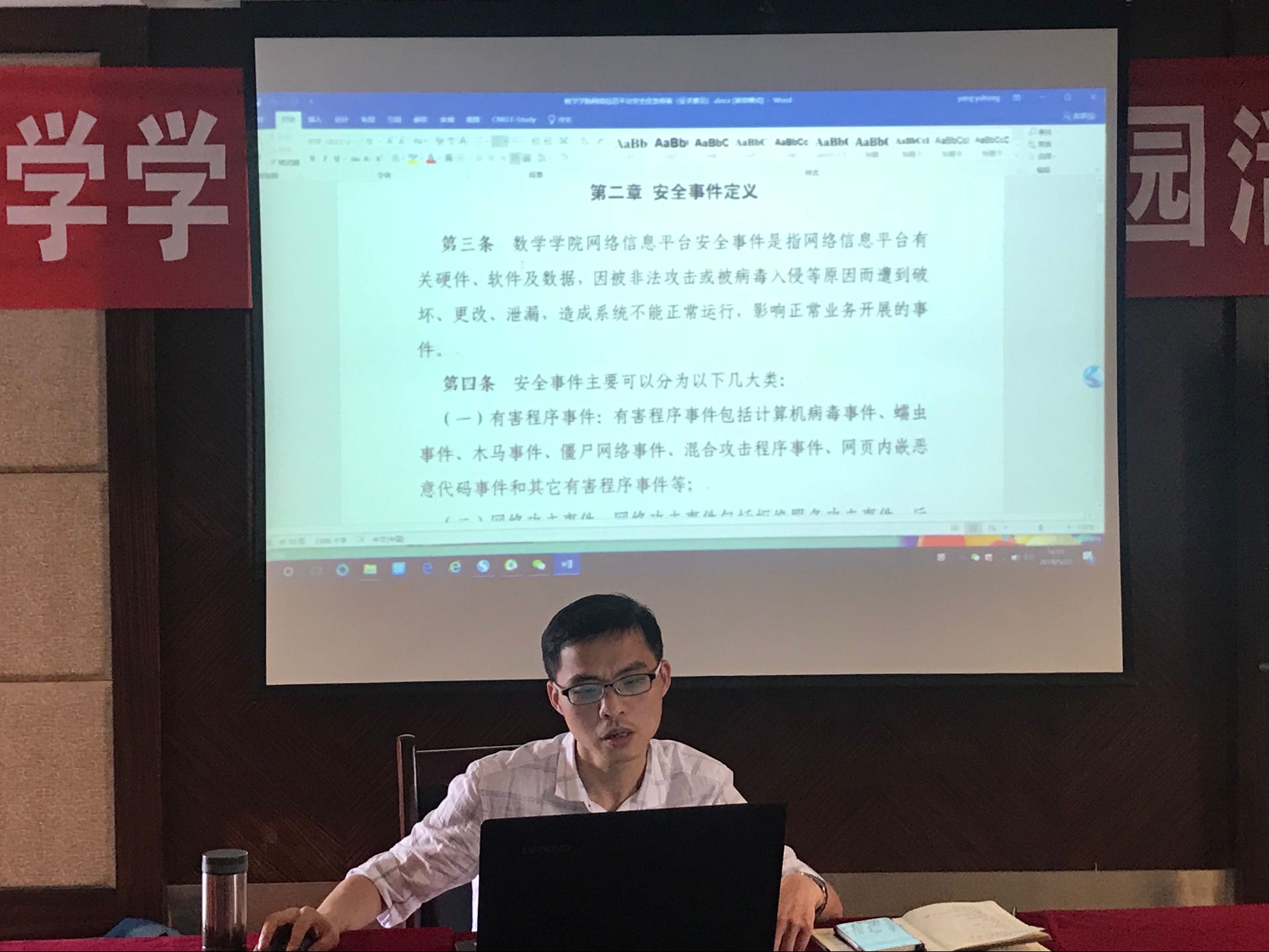 紧接着杨育鸿老师对数学院系网站操作规程进行了讲解,经过这次网络信息安全培训,学院新闻工作者认识到了学校和学院对网络安全的重视,将使学院的网络平台建设更有保障。