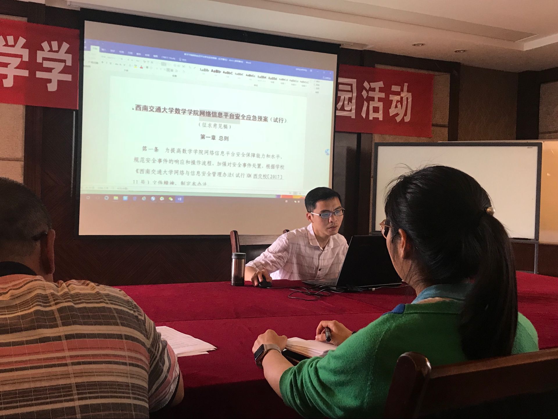 5月21日下午,数学在学院工会之家2501,组织进行了网络信息安全、信息发布操作培训会。学院党委副书记杨育鸿老师主持并主讲,参加培训的有数学学院各系、各机关老师代表,以及新闻中心的同学们。会议旨在为数学学院网站管理者普及学校下发的有关信息安全的文件,以保障校院网站健康运行。