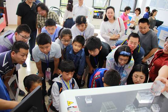 下午,家长与孩子们来到交大创客空间参观。金工坊、木工坊、快速原型工坊......看得孩子们目不转晴,家长则笑称:“涨姿势了”。