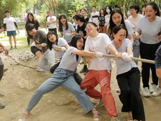 此次比赛以各系为单位,采取循环赛的方式进行,共计10局,由院长朱旻昊担任裁判员。“预备……嘟”,裁判员的哨声刚落,加油呐喊声已起。选手们紧紧握住绳子,弓步后倾,在各自的口令下充分发挥“人心齐,泰山移”的干劲,场上的拉拉队员同样热情高涨,为参赛的队伍呐喊助威。上半场比赛结束后进行中场休息,由学生工作组的老师们为大家带来了动感的舞蹈,展现青春活力。第6局比赛开始,双方总结上半场的经验,合理安排“战术”,优化站位和喊口号的节奏,拔河比赛的节奏更加跌宕,精彩的比赛,让人拍手叫好,比赛场地上欢呼声,喝彩声、掌声不绝于耳。