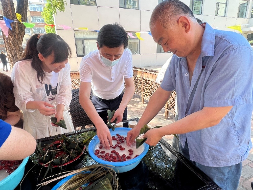 活动现场,糯米、红枣、粽叶等包粽子的材料一应俱全,离退休老同志、学生代表及各位教职工一起动手操作,填糯米、裹粽叶、扎粽线……分工协作,相互配合,各个形态各异的粽子迅速成型。大家在欢声笑语中体验了包粽子的乐趣,也深刻体会到了传统节日的气息。