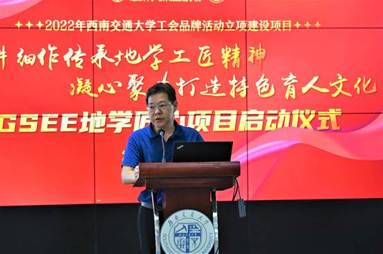 学院党委书记关秦川介绍项目建设方案。关秦川书记说2022年best365英国在线体育工会品牌活动立项建设项目“精耕细作传承地学工匠精神 凝心聚力打造特色育人文化——GSEE地学匠心项目”从36个申报项目中脱颖而出获得A类立项建设项目支持,该项目融合了测绘、地质、环境、消防四大系8个专业的教师及相关科研团队,党政工团、老中青学参与,重点围绕思想洗礼、建功立业、文化浸润、为生服务四个篇章展开,旨在从思想认识、本领提升、文化熏陶、行为引领方面促进教师成长,营造积极、健康、和谐的地学文化氛围,增强地学学院教职工对交大文化、地学特色的身份归属感、价值认同感和情感自豪感,做到语言一致、行动统一、风格相近。他指出,“GSEE地学匠心”品牌项目立足地学学院,以建构“地学视野下的工程教育、教学、思想、文化、情境、伦理等问题的教师、教育、教学共同体”为目标,发扬地学“传帮带”的历史传统,调动各年龄段工会成员的积极性,塑造地学匠心精神,增强地学教师的身份认同感、团体归属感和集体荣誉感,引领带动地学学院全体老师,扎根中国大地,立足地学学科,用爱心和责任心传承匠心;并结合党委层面的“地心引力”、学院层面的“地学匠心”、青年师生层面的“地新引力”三个项目,阐释项目建设的重要意义和深刻内涵。同时,关秦川就地学匠心品牌项目的具体实施进行介绍,希望通过地学匠心项目,促进学院各项工作多点开花、亮点纷呈,“凝心聚力、蓄势薄发”,建功新时代,谱写学院新的篇章。