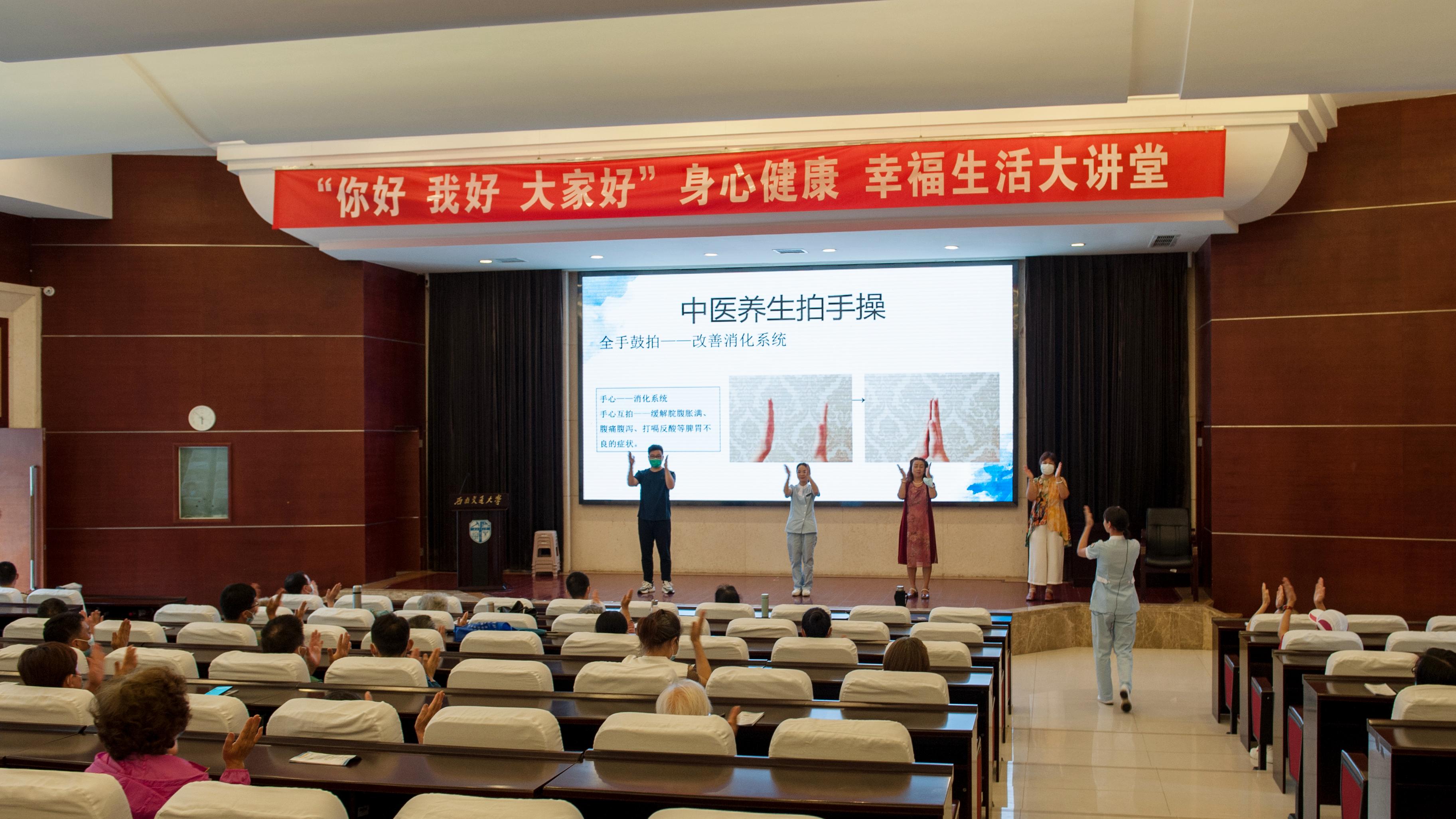 最后,在互动环节,中心医护人员带领现场教职工边学边练,共同完成了五套中医养生拍手操学习。