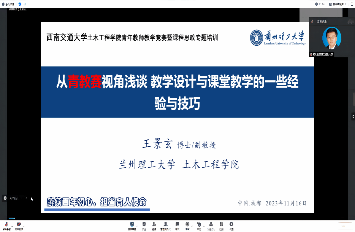 兰州理工大学的王景玄副教授通过远程连线的方式向在场的青年教师分享了自己参加全国高校青年教师教学竞赛并获得佳绩的过程与感受,详细阐述了他在讲授《混凝土结构设计原理》课程一个章节过程中的教学设计、教学思路、教学方法与教学反思,展示了一个优秀的课堂教学范例。