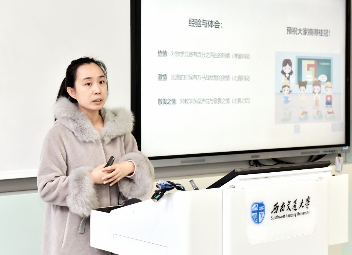 袁冉副教授曾荣获第五届四川省高校青年教师教学竞赛二等奖。她在活动中当场示范了《土力学》课程教学中一个章节的讲解。她的示范讲解充分展示了如何生动阐释枯燥的科学原理并润物无声地植入思政元素的教学技巧。她还热情鼓励其他青年教师踊跃参加教学竞赛、力求斩获佳绩。