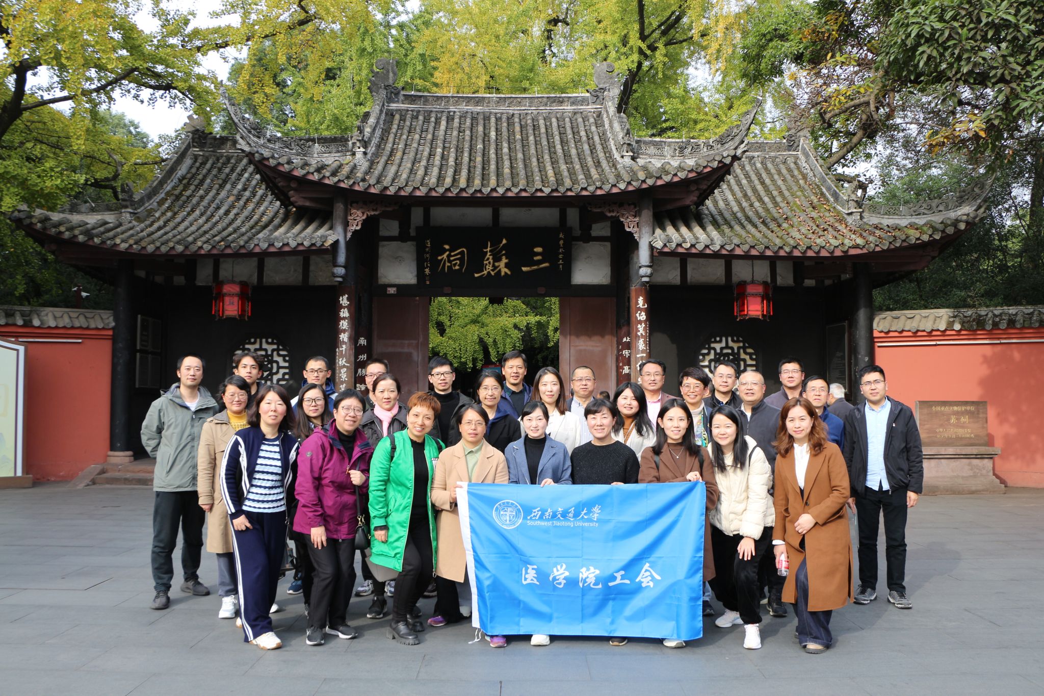 为了弘扬中华优秀传统文化,增进教师的文化素养和团队凝聚力,医学院工会于11月17日下午组织教师前往三苏祠参观学习。三苏祠是我国著名的文化圣地,是苏洵、苏轼、苏辙父子三代文人的纪念馆,也是2022年6月习近平总书记视察成都时参观的重要场所。
