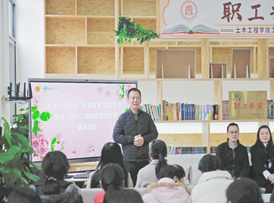 38日上午930,土木工程学院庆祝第114个“三八”国际劳动妇女节插花活动在九里校区学院职工之家举行。土木工程学院院长蒲黔辉、副院长富海鹰、副院长勾红叶、副书记周曦、副书记车小洁,校工会组织(女工)部部长陈秀梅老师,学院女教职工、工会干部和机关党支部党员参加了活动,活动由学院工会主席王艺霖主持。