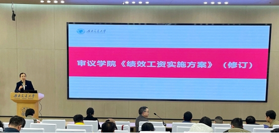 会上,学院俞森林院长报告了本次绩效方案修订的工作背景、修订原则和修订过程。他指出,本次绩效方案修订工作,立足学院发展的新形势,在总结现行绩效方案不足的基础上,继续坚持成果成绩成效导向,按照优绩优酬的分配原则,有效发挥绩效的激励导向作用,以实现学院高质量发展。
